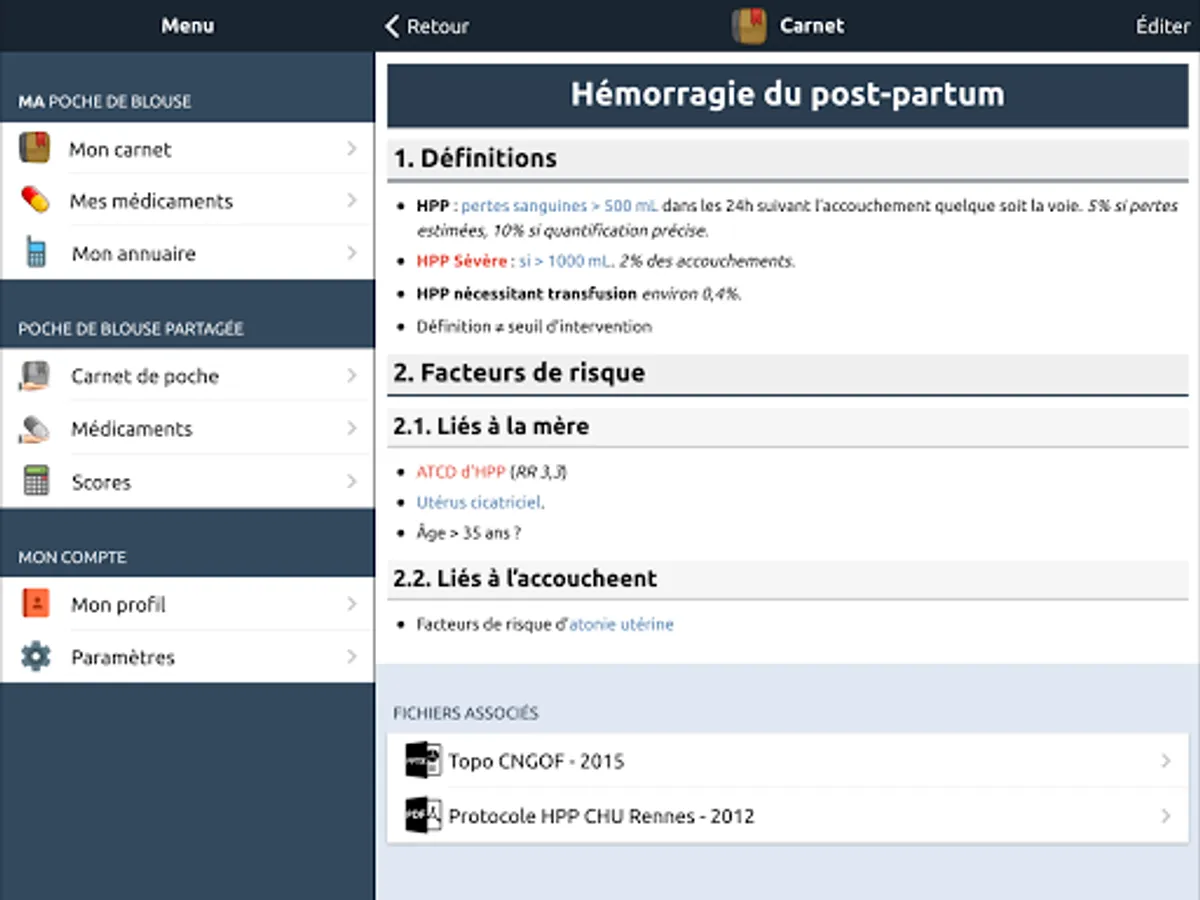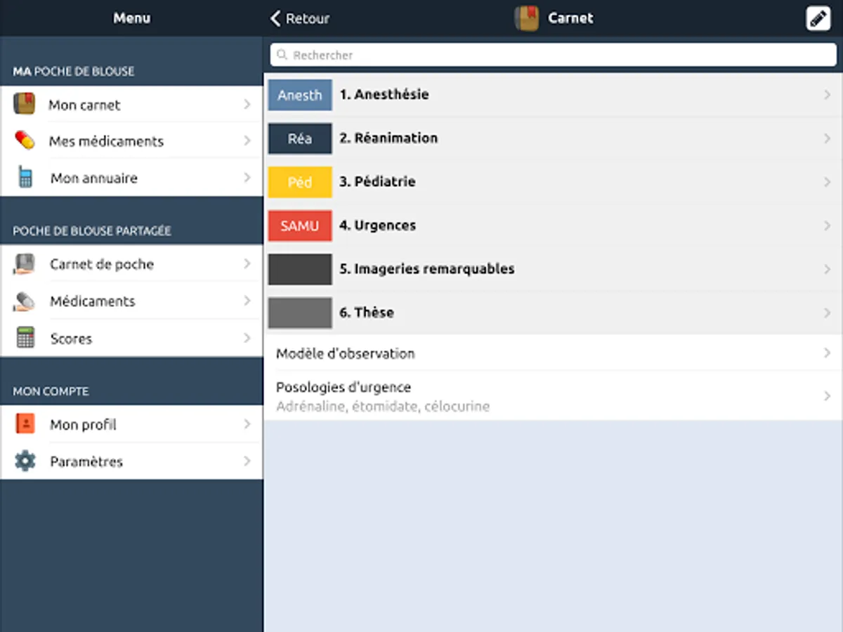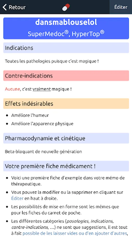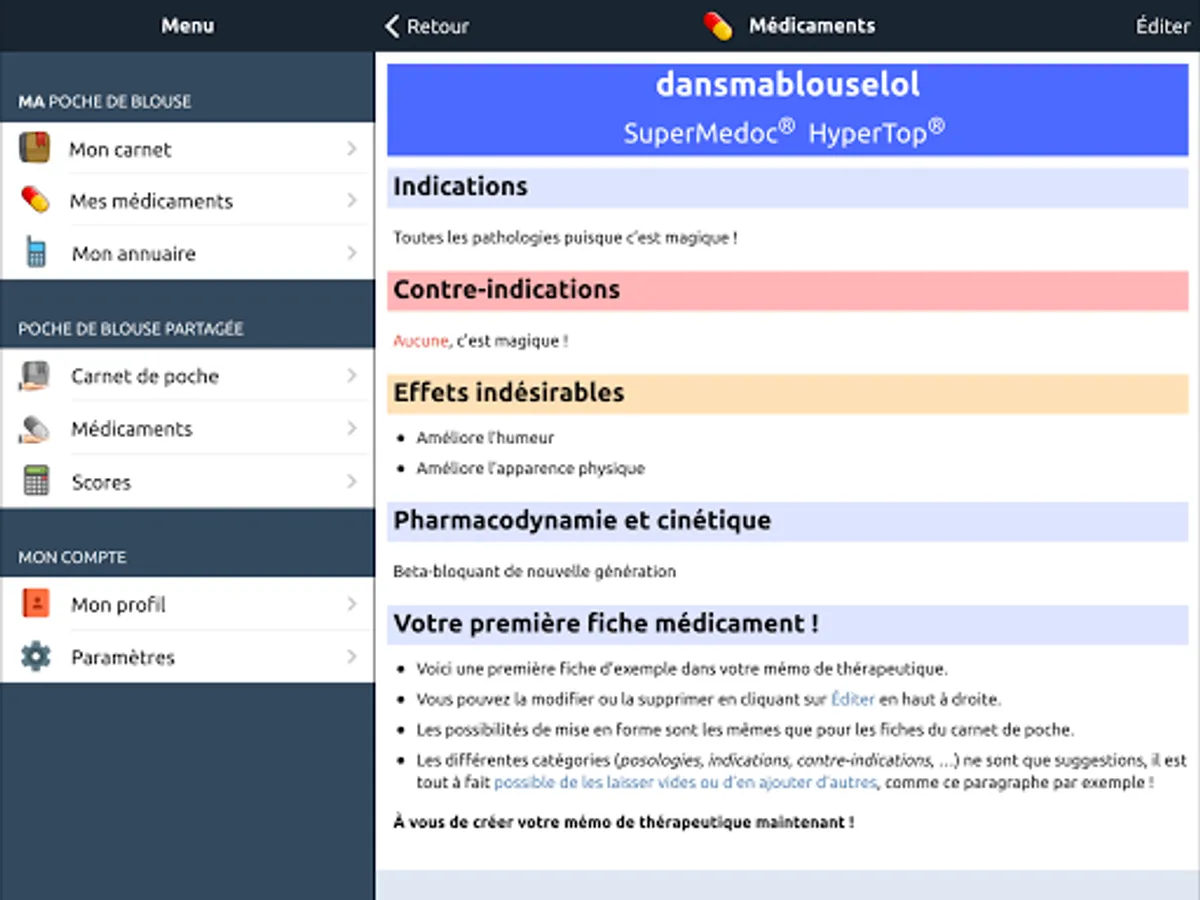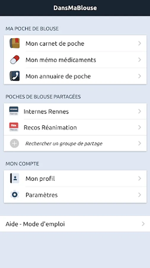 This application is the companion of DansMaBlouse.fr, a "digital blouse pocket" for health personnel (internal, external doctors, nurses, IADE, ...). Stop storing manuscript notebooks, scribbled flyers, photocopied protocols in your smock pocket: adopt an application made for all that! Build your knowledge base as you practice, so you'll quickly find information you've already looked for.