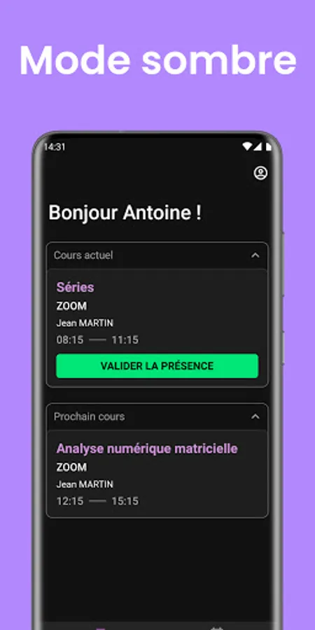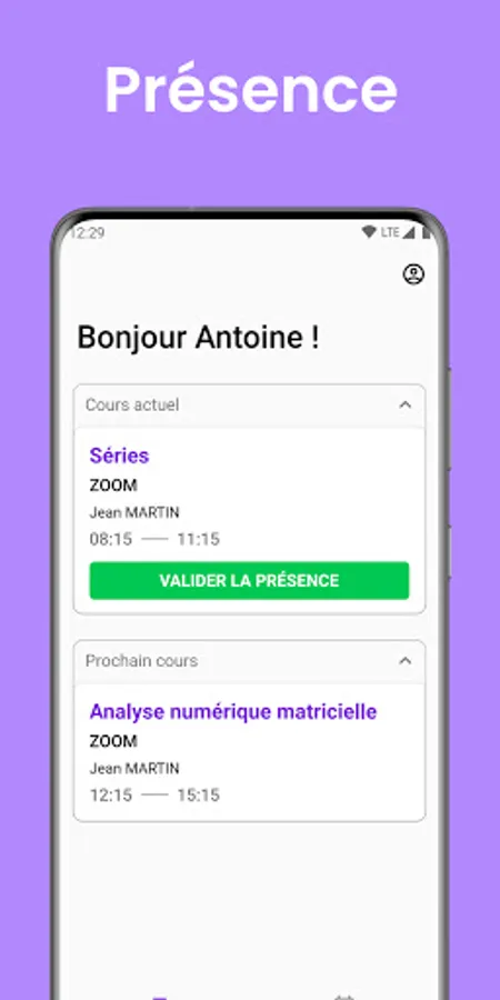 myDevinci allows you to follow the call status for the current class and validate your attendance with one click from the homepage. You will also find the list of your next courses there.