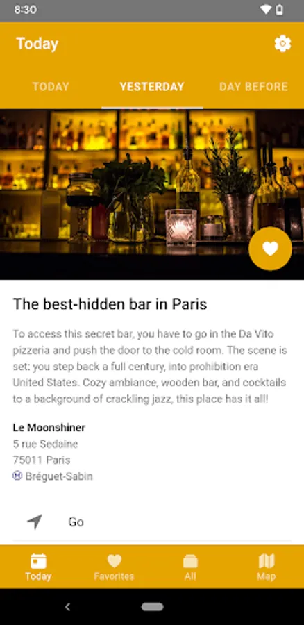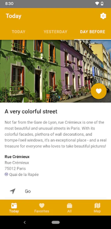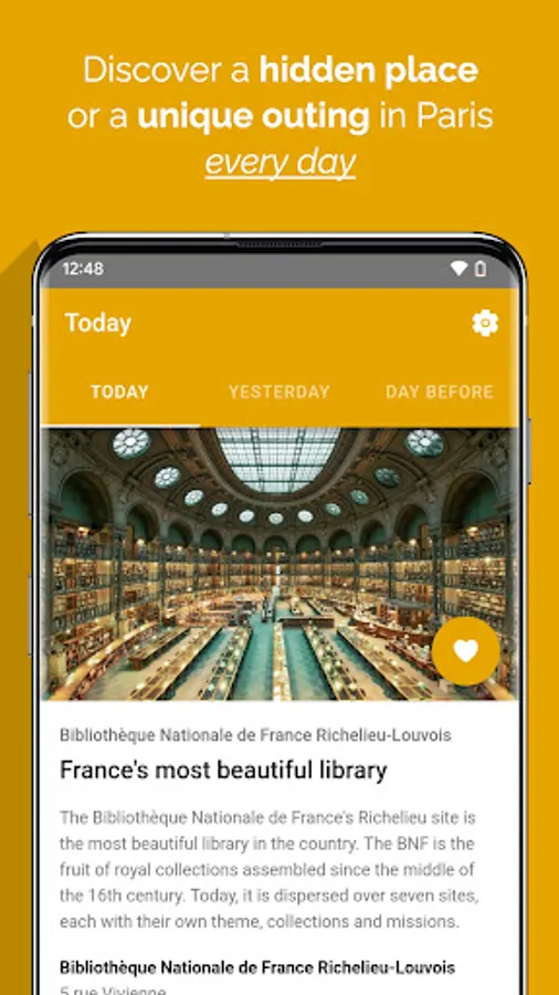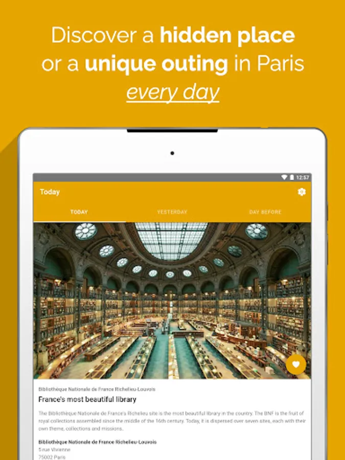 Secrets de Paris is the first app that lets you discover every day a novel and inventive hidden treasure of the world's most beautiful city. The most beautiful rooftops, the secret passageways, the quirkiest streets and monuments, restaurants built around fun and innovative concepts, unexpected boutiques...