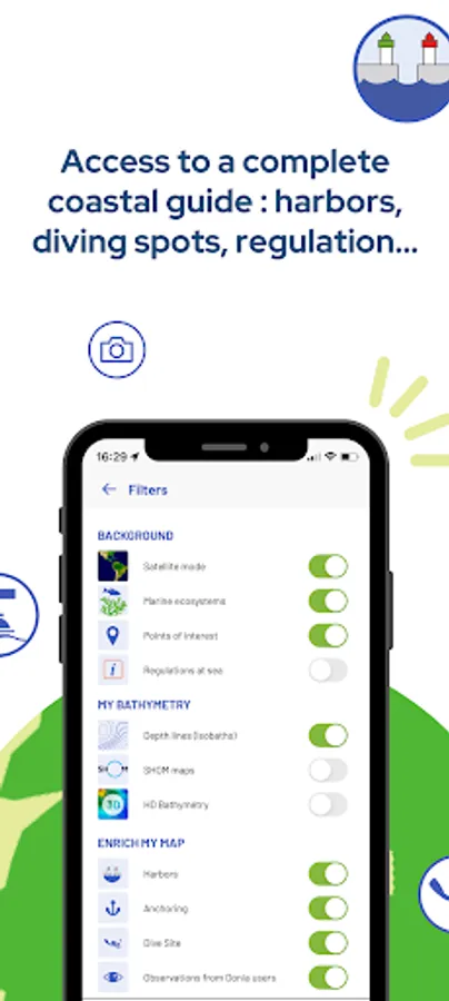 - Access all the useful information for your trip at sea: ports, regulations, diving sites