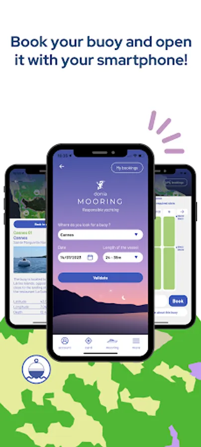 The DONIA application incorporates the mapping of buoys and mooring boxes into a buoy reservation module called "DONIA Mooring". It integrates, in real time: the availability calendar of these mooring devices, pricing by class of vessel and slots, reservation and management of secure payment via mobile phone.