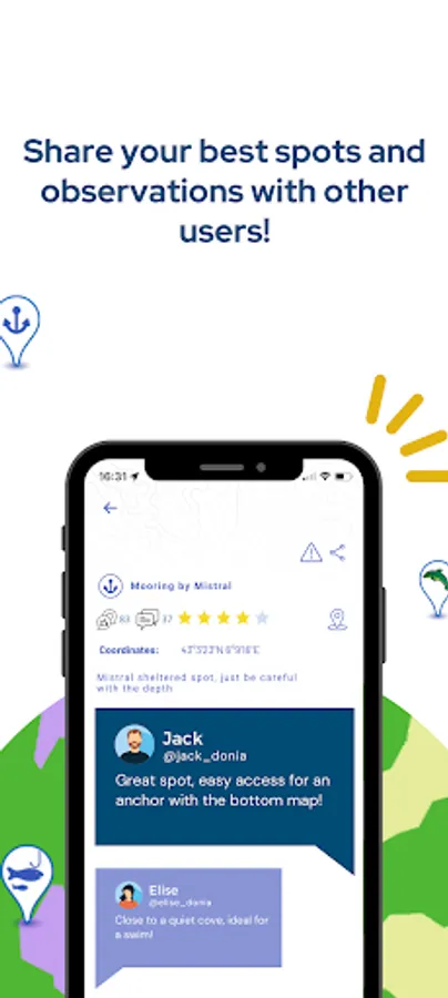 - Share your observations with other users: anchorage spots, marine mammal sightings, obstacles at sea, etc.