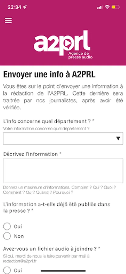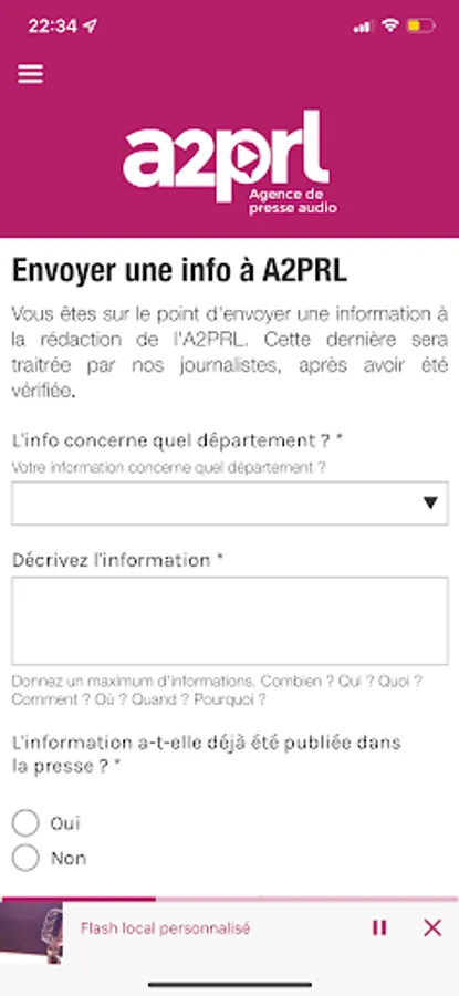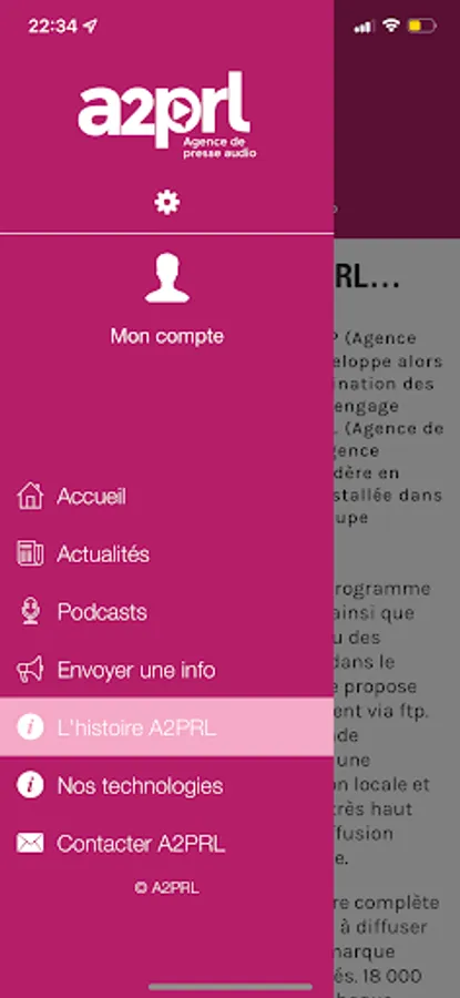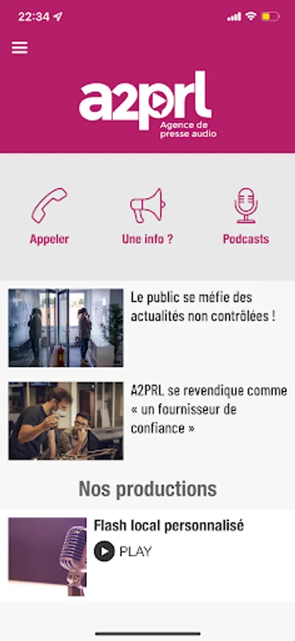 With the new A2PRL mobile application, follow the news of the 1st audio press agency in France, listen to the latest express flash produced by the A2PRL team, follow the agency's news and easily contact the team.