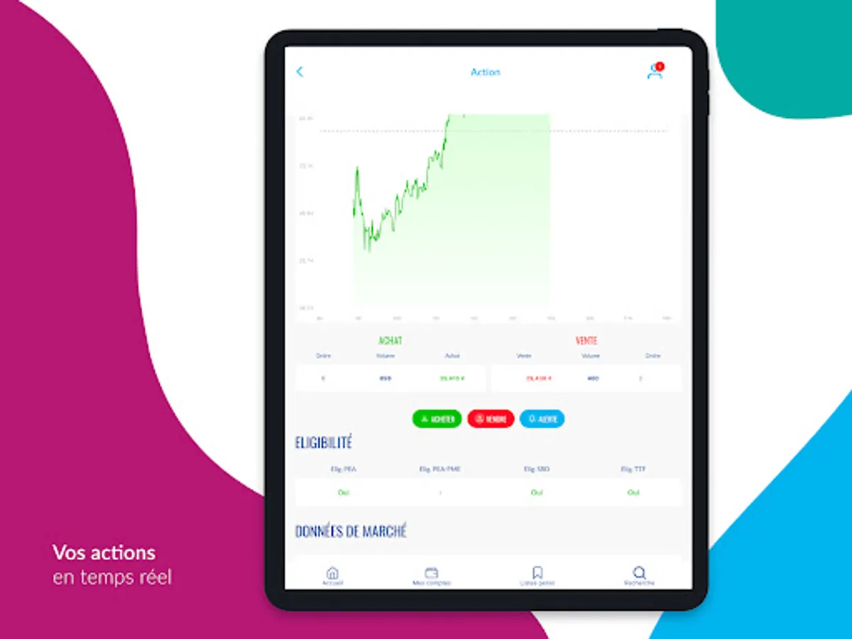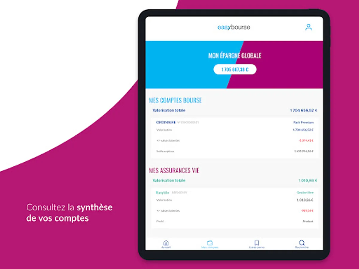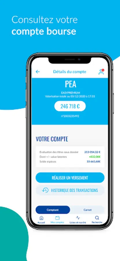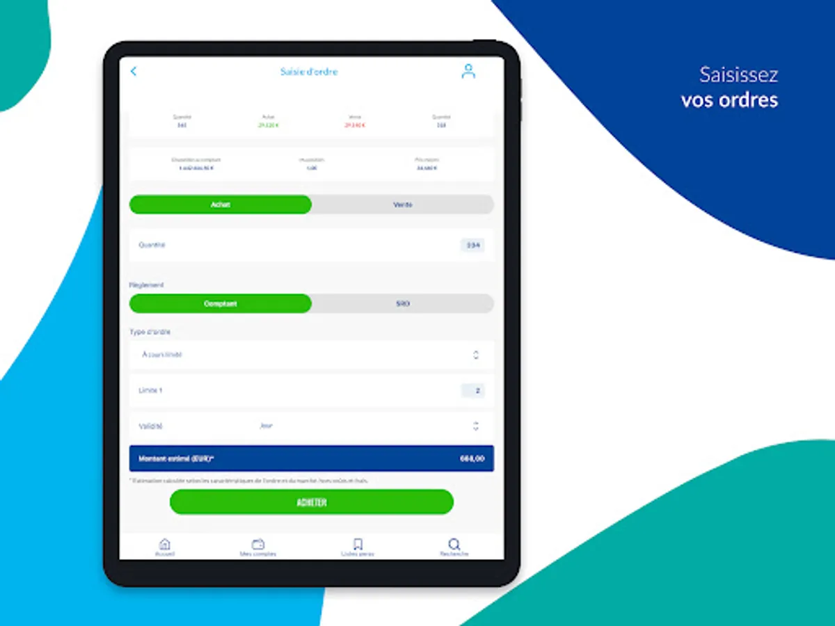 - Consult and manage your accounts easily with essential information directly visible to help you make your decisions quickly : debit /credit situation, pending profit and loss, cash invested and available, cash and deferred settlement service order books…