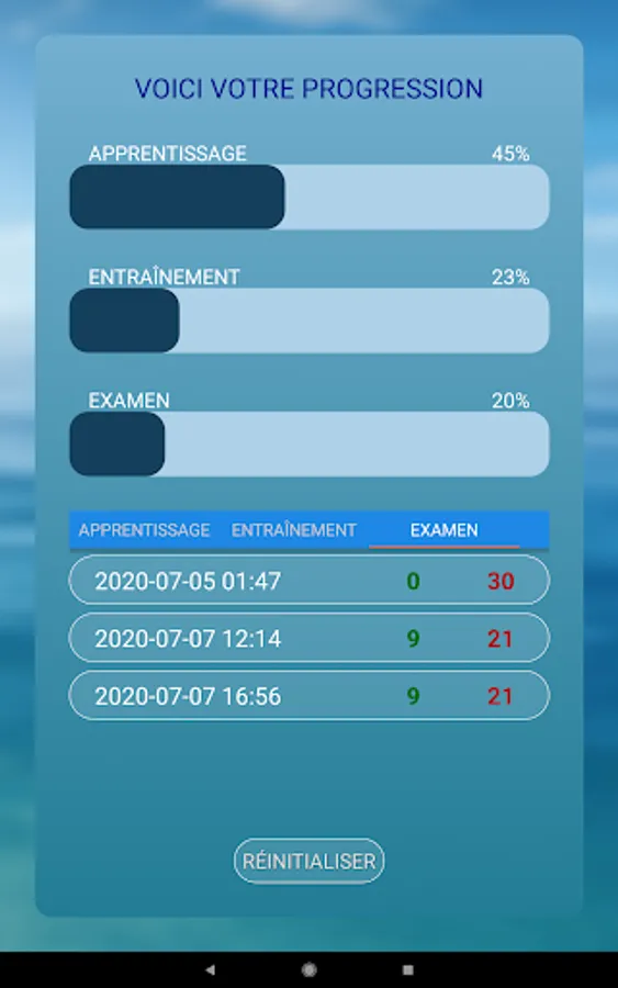 The "training" mode will allow you to familiarize yourself with the exam comprising 40 questions including 5 on VHF but without any time limit.