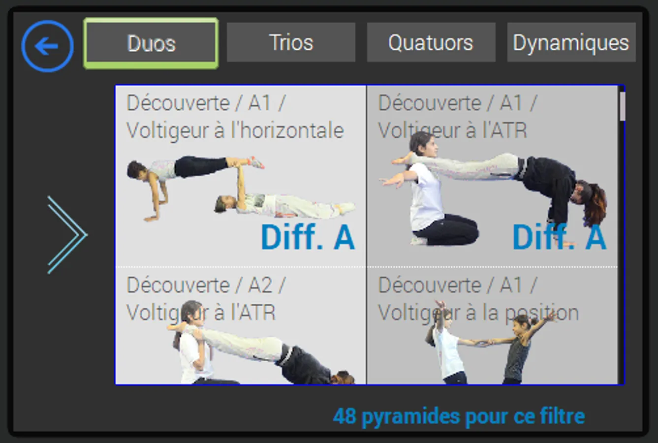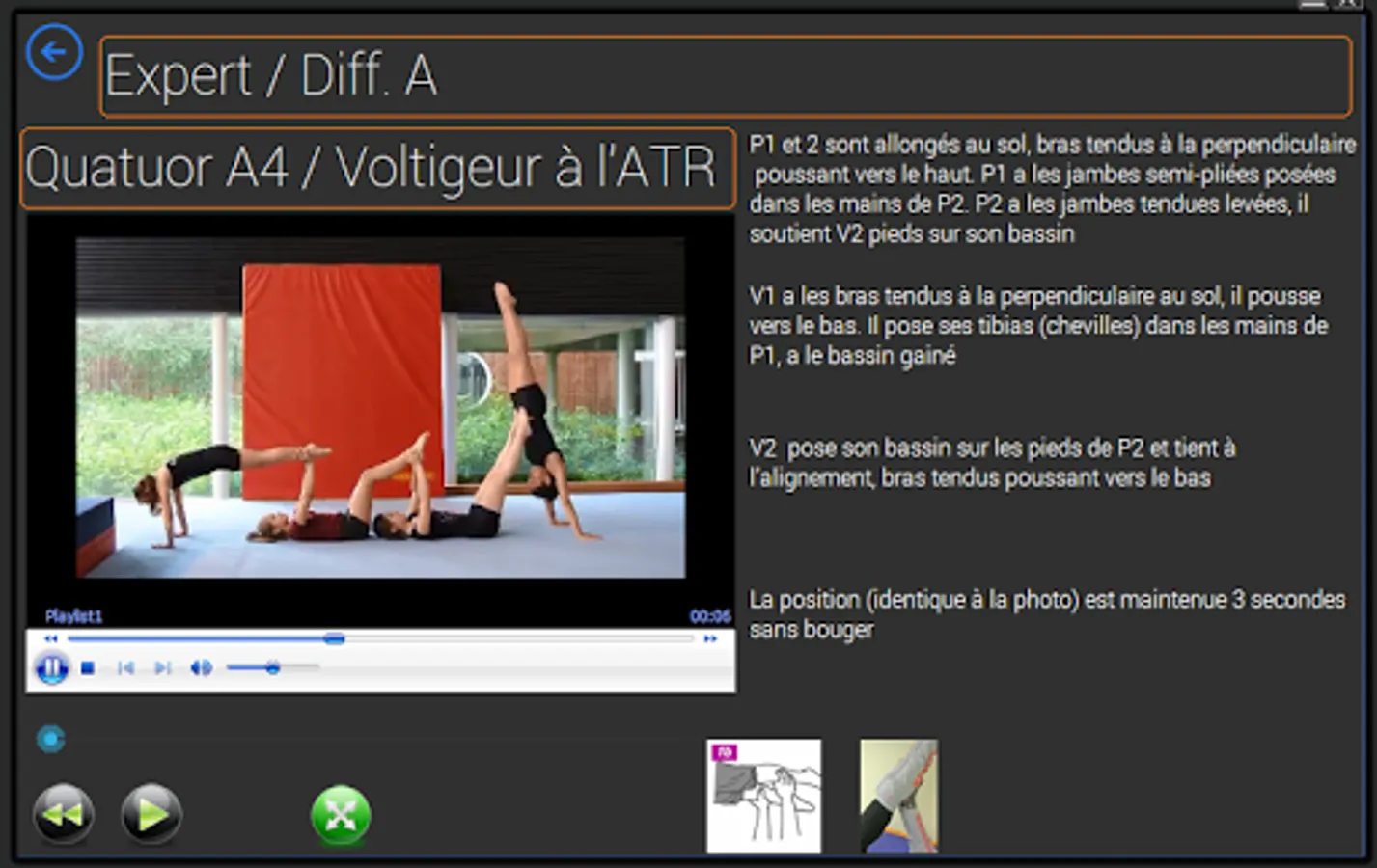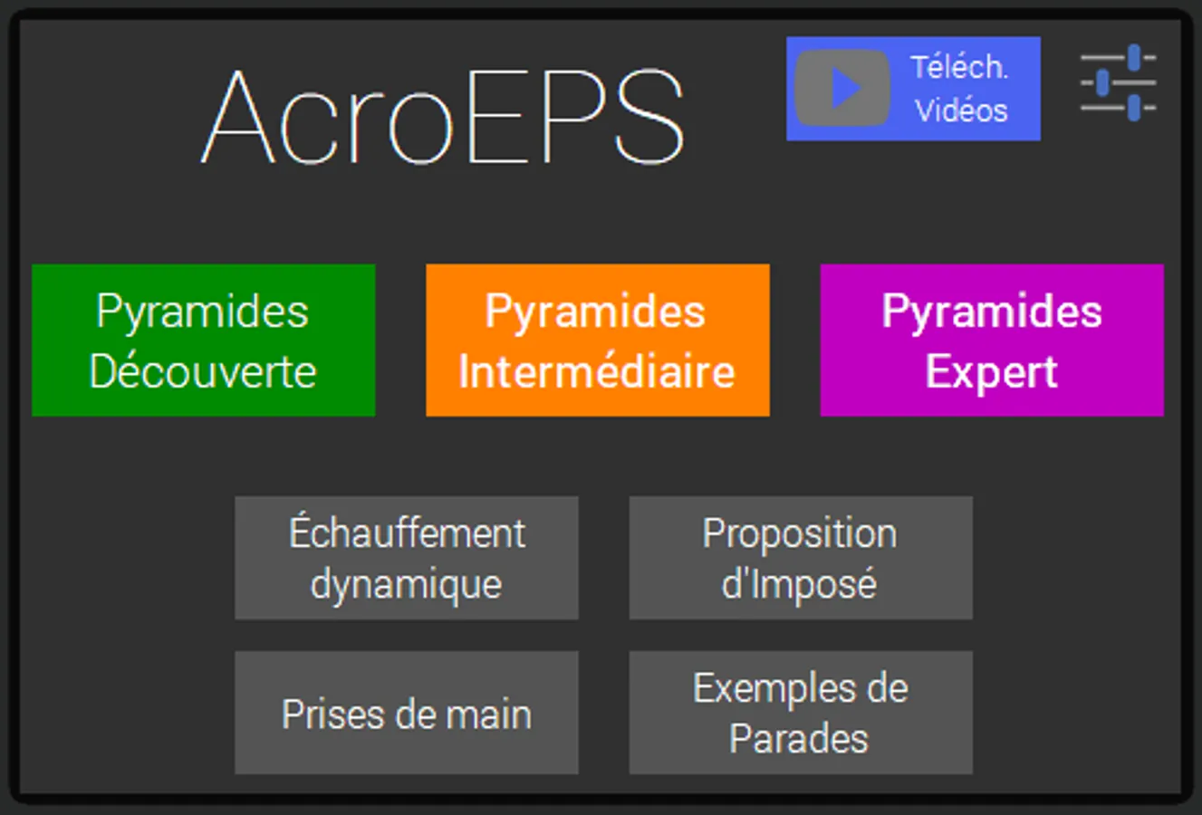 On an original idea of J.Caillot and Y.Tomaszower, find in this resource a vast repertoire of pyramids in Acrosport whose assembly and disassembly are presented in the form of video capsules with the expected criteria of accomplishment and recommended hand-taking. A listing of these hands, an example of imposed or warm-up exercises and parries complete this application.