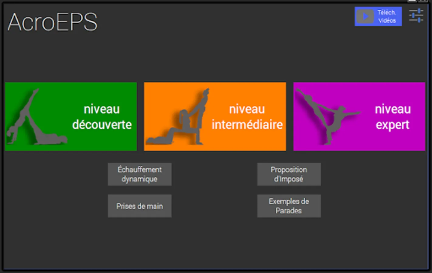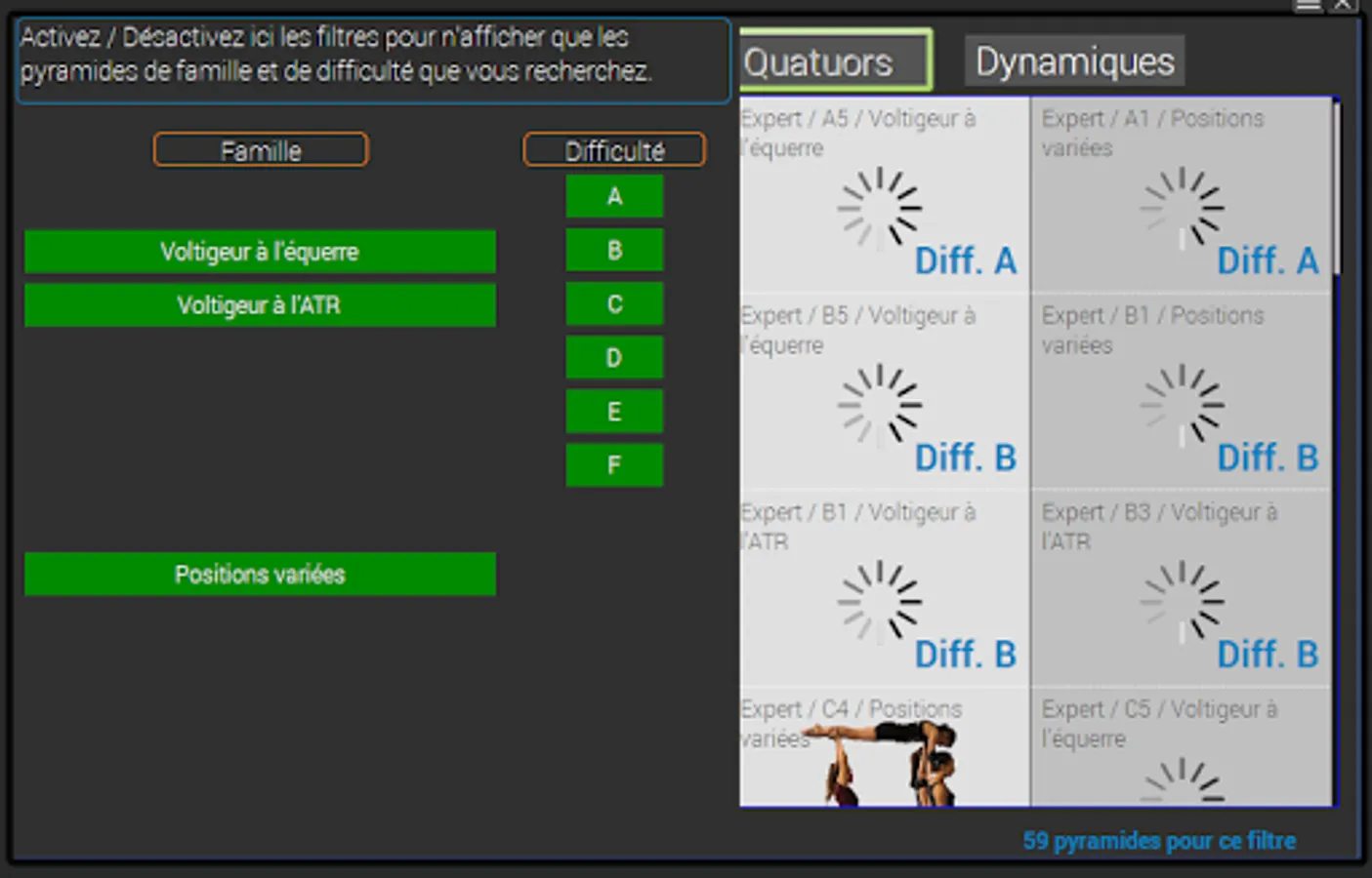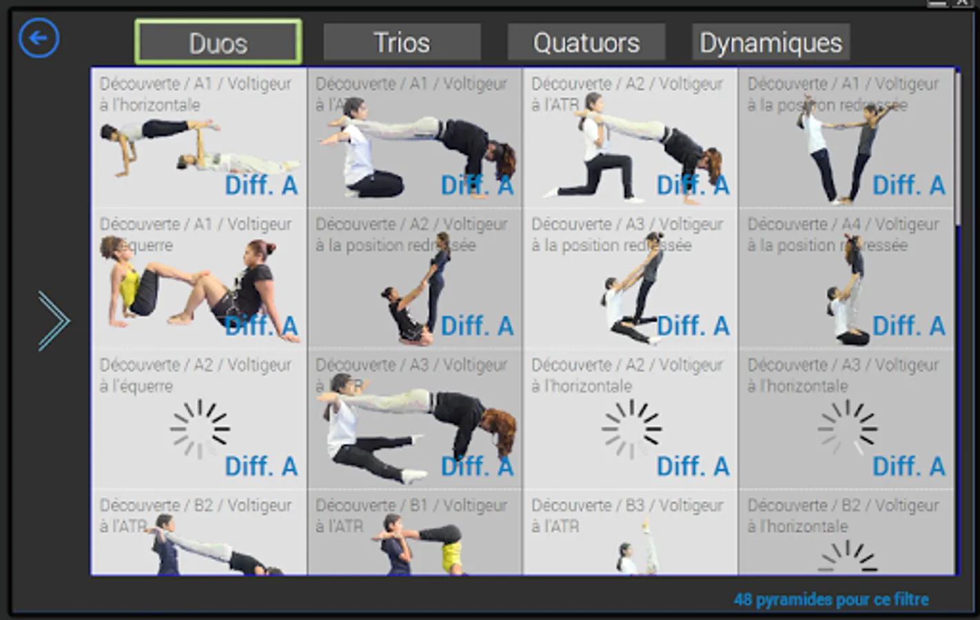 On an original idea of J.Caillot and Y.Tomaszower, find in this resource a vast repertoire of pyramids in Acrosport whose assembly and disassembly are presented in the form of video capsules with the expected criteria of accomplishment and recommended hand-taking. A listing of these hands, an example of imposed or warm-up exercises and parries complete this application.