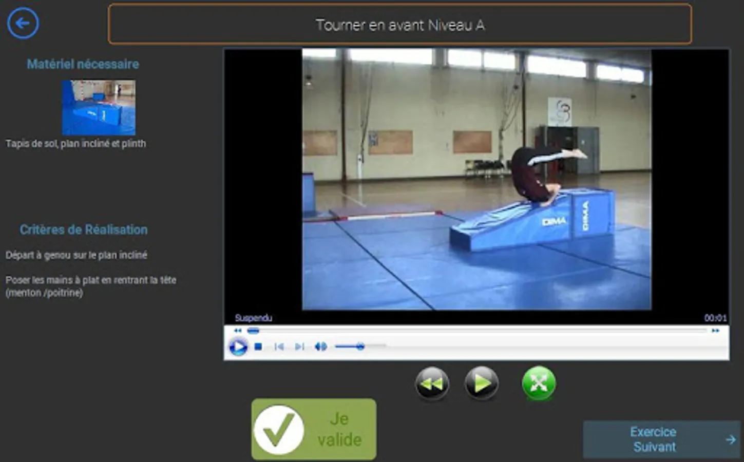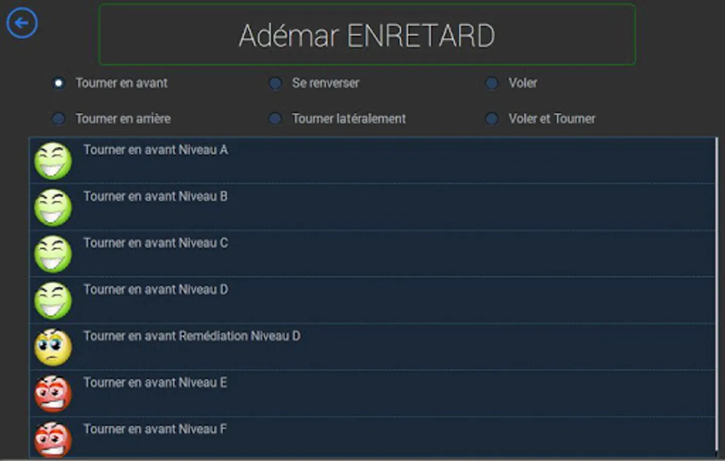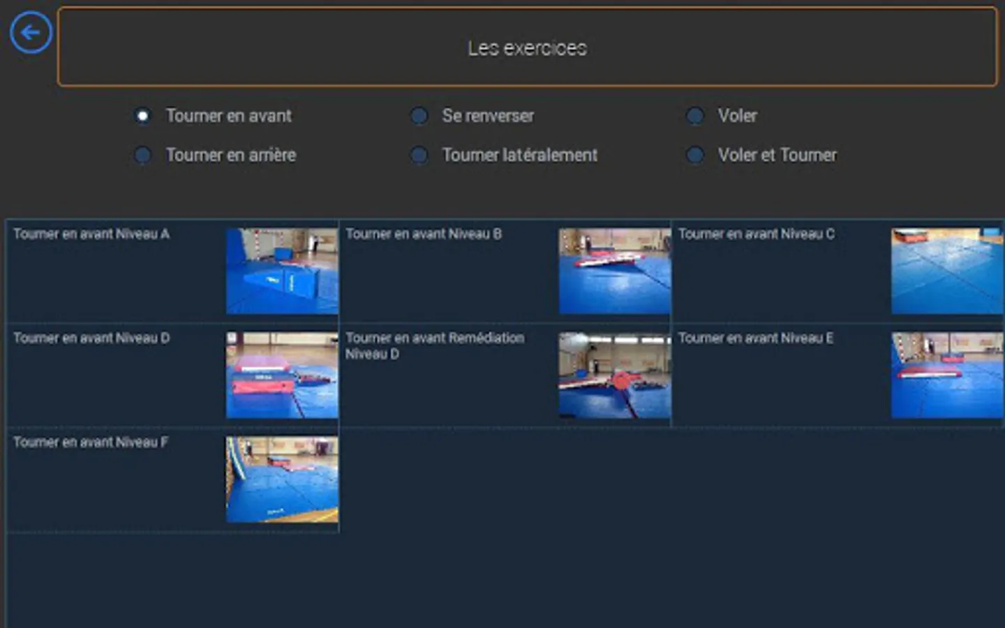 This application, in the form of workshops, offers a progression in sports gymnastics. The exercises, classified by families (turn forward, turn back, turn longitudinally, reverse, fly, fly and turn), are hierarchical levels A to F.
