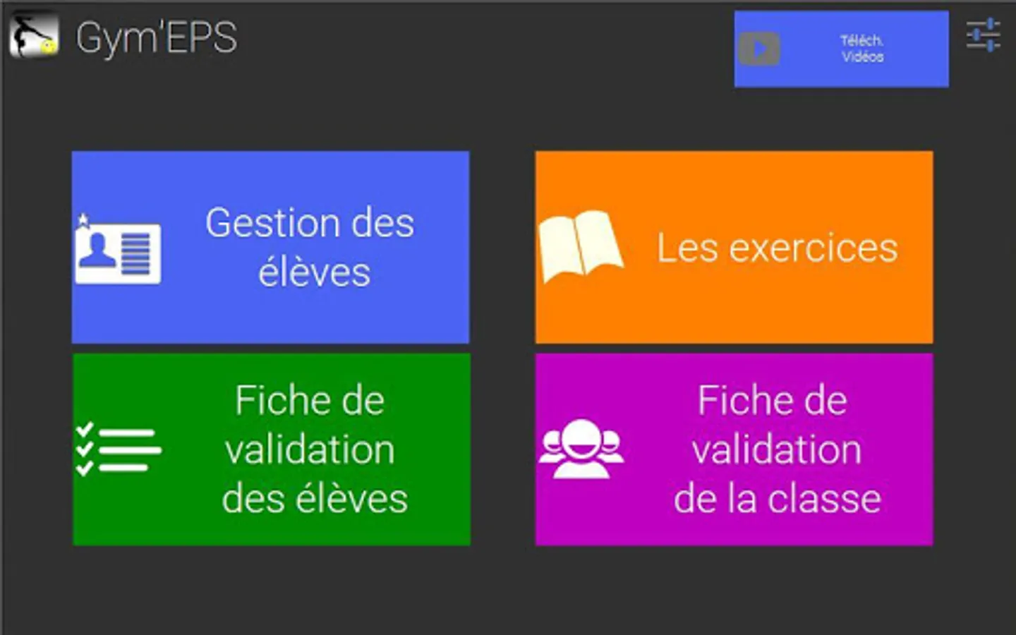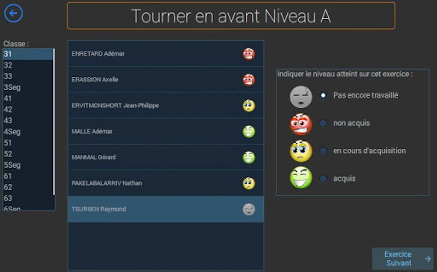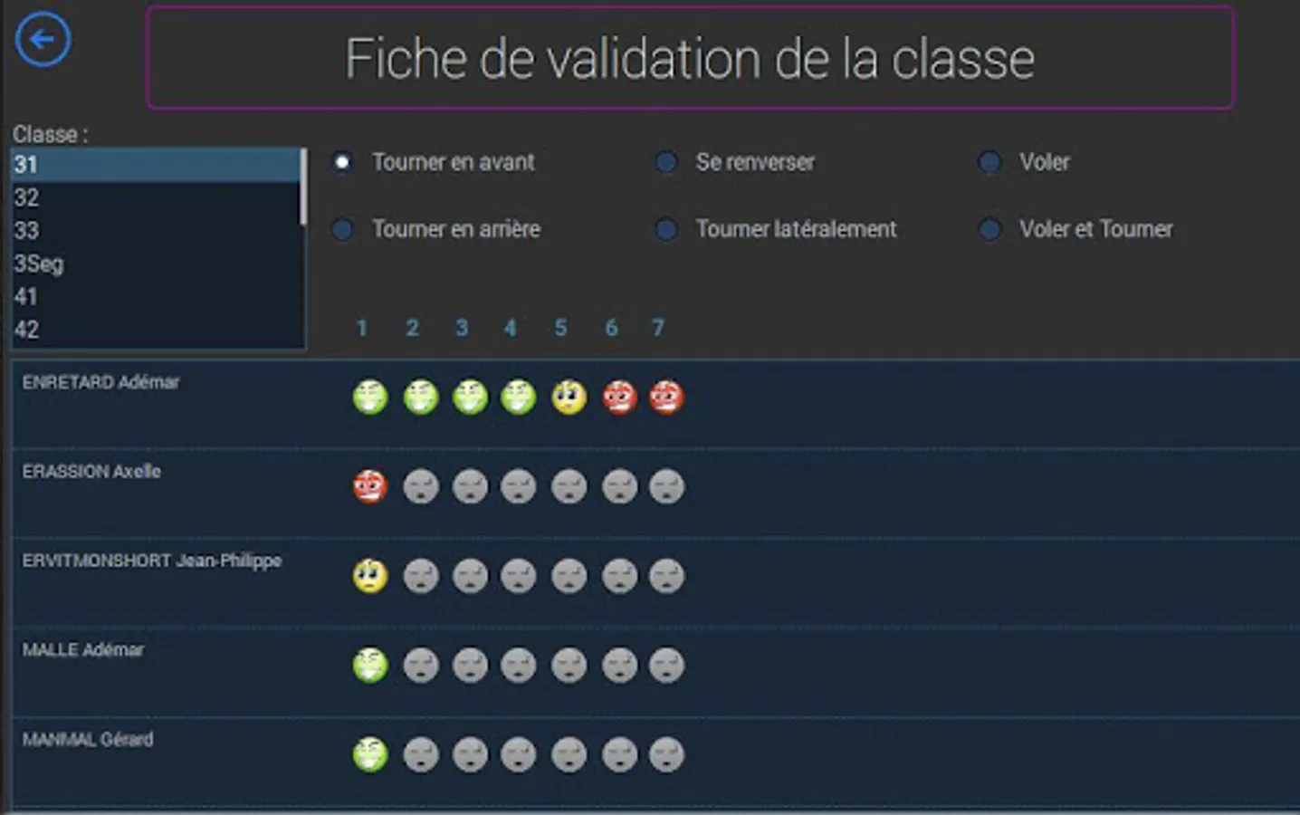 This application, in the form of workshops, offers a progression in sports gymnastics. The exercises, classified by families (turn forward, turn back, turn longitudinally, reverse, fly, fly and turn), are hierarchical levels A to F.