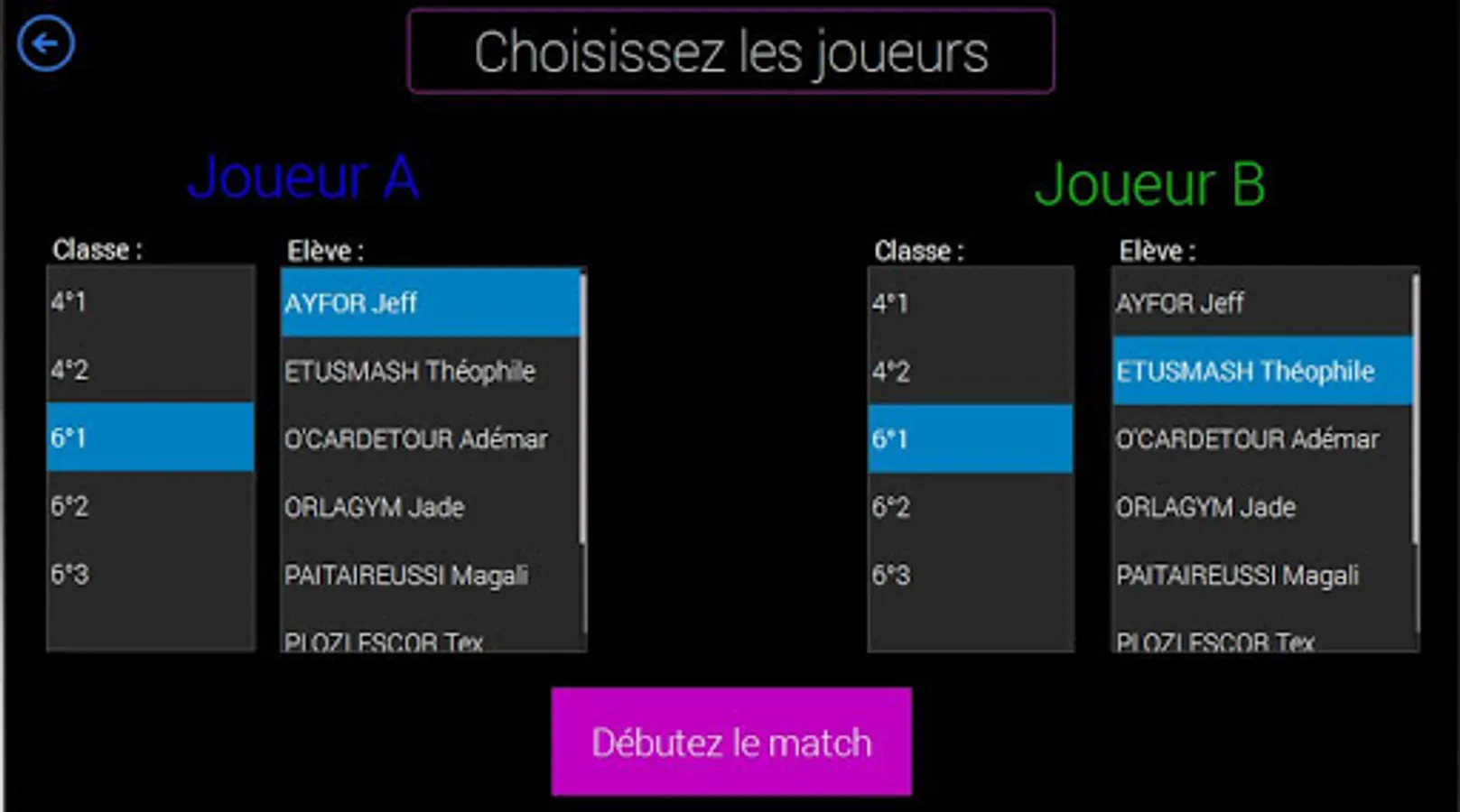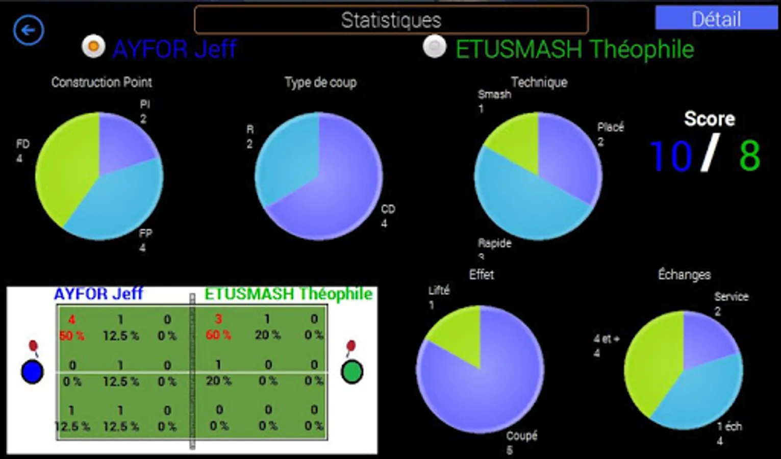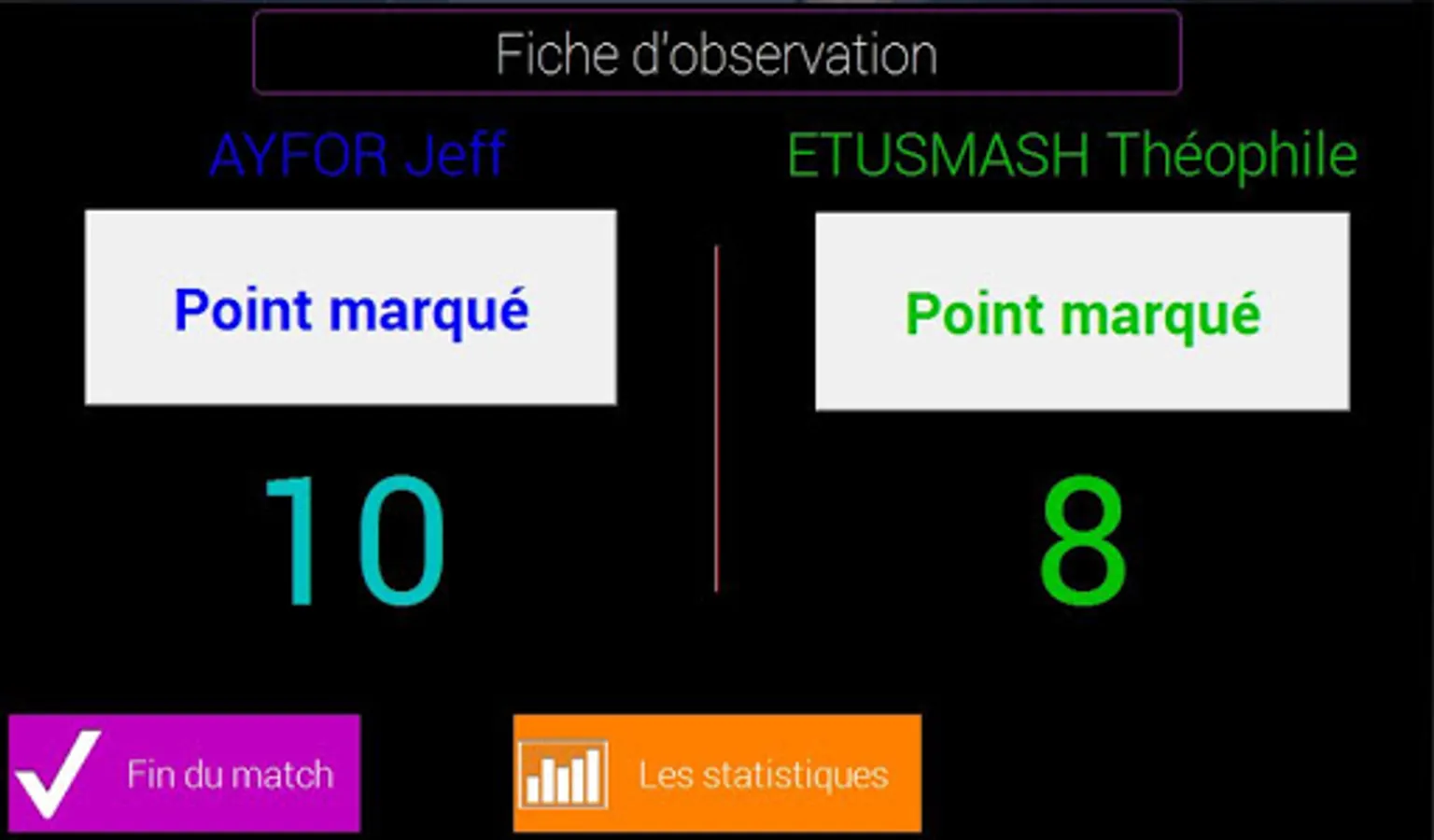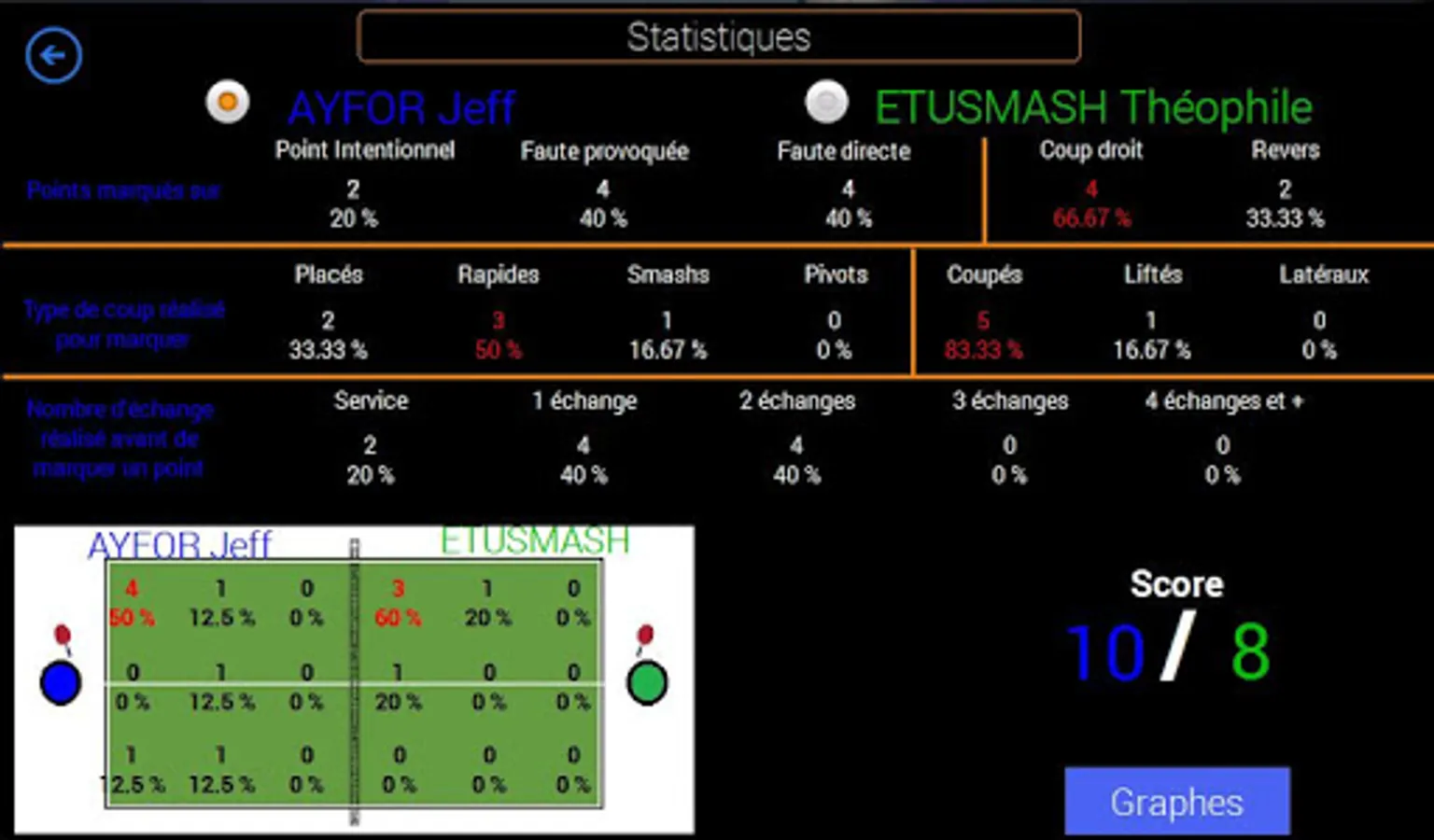 This application dedicated to the teaching of EPS allows analysis during or at the end of a table tennis match play profile of each player (types of strokes used, effects, game area on the table, number of exchanges ...)