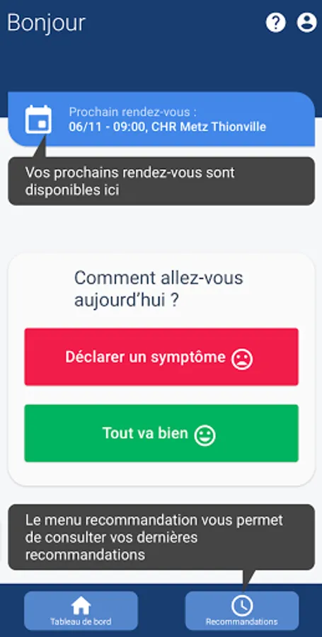 Digital application intended for the management by patients of the adverse effects of their cancer treatment: advice, recommendations, making consultation appointments, or calling the SAMU according to the level of severity identified.