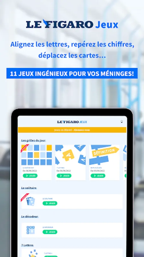 🎲 Looking for word games? Number games? Quote games? A sudoku game? A game of solitaire? The Figaro Games application offers you games mixing letters, numbers and cards. From Arrow Words to the Decoder through Pairs or lose, 11 games of words, letters, card games and games with numbers! Free word, card and number games with additional parts and puzzles for subscribers. And the famous Laclos crossword!