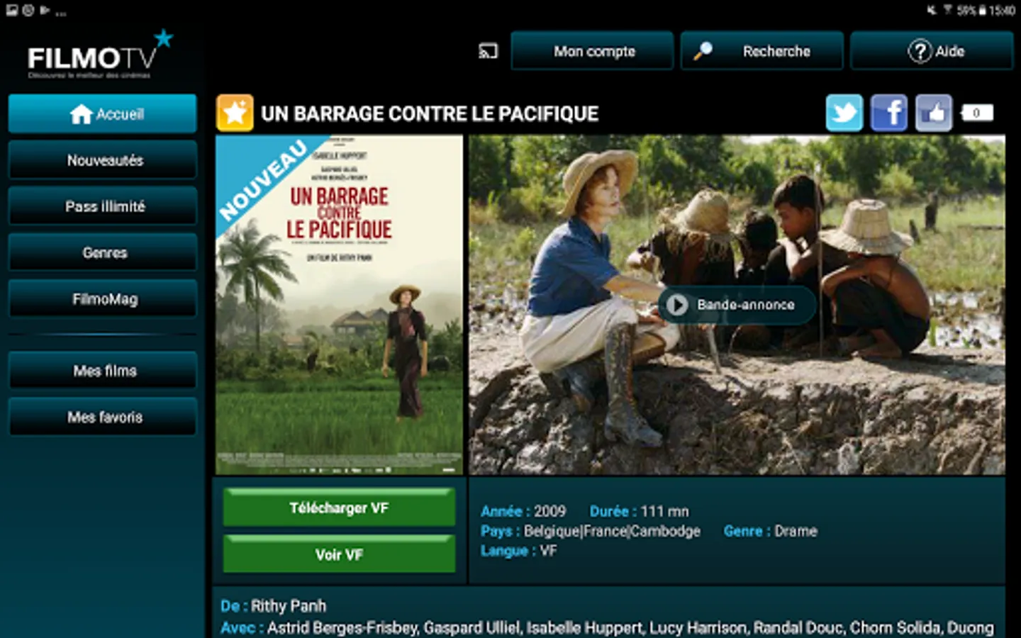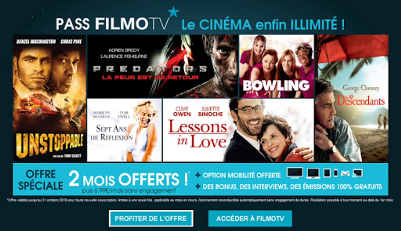 Available from 6,99 € per month on computer (Mac and PC) via www.filmotv.fr, Smart TV (LG, Philips, Samsung and Sony), tablets, smartphones (Android and IOS), consoles (PS3 and 4) ), Chromecast, on Bouygues Boxes, Free, Numericable, Orange, BOX videofutur. Movies are visible in adaptive streaming or downloadable and accessible from FilmoCloud for more mobility