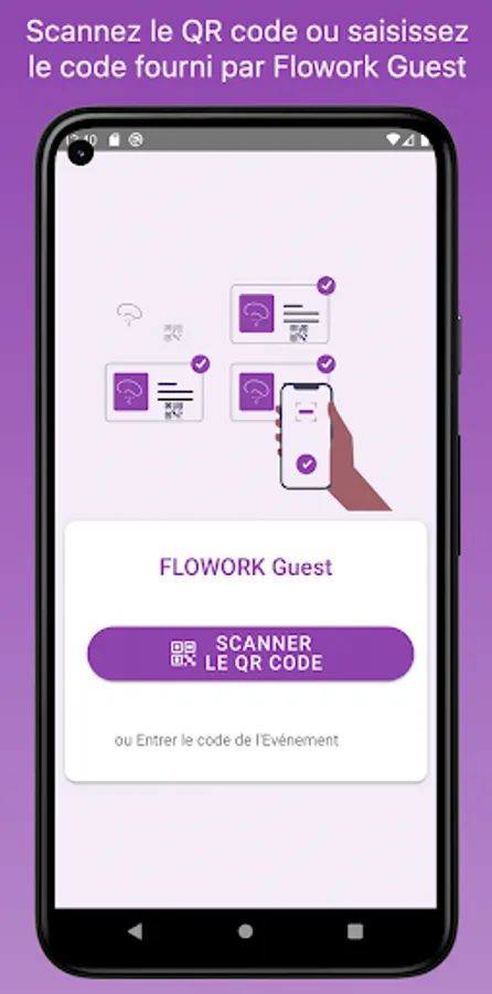 - Access the management of your event by scanning its QR Code or by entering its encrypted code generated and provided by the FLOWORK Guest system