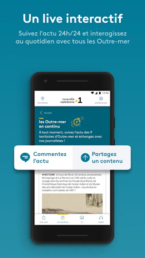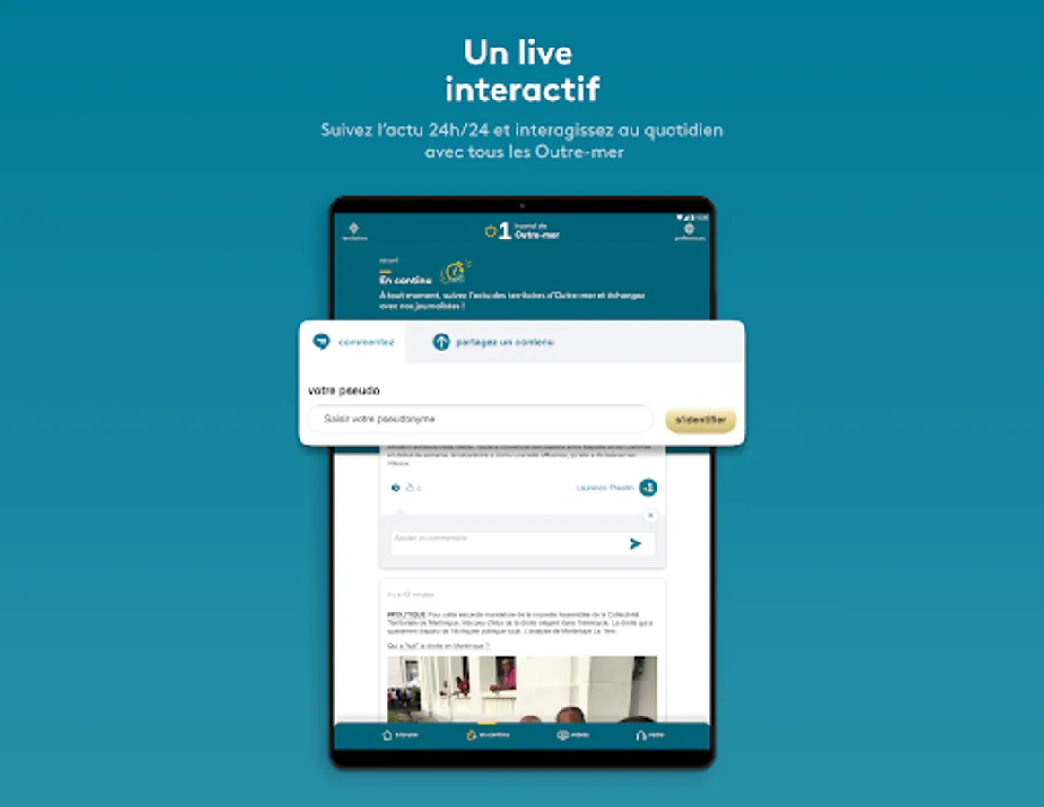 Thanks to the new “Continuous” section, access to an interactive live stream to follow information in real time on all overseas territories. 24 hours a day, interact with journalists and the ultramarine community of the 3 oceans, share your photos and videos.
