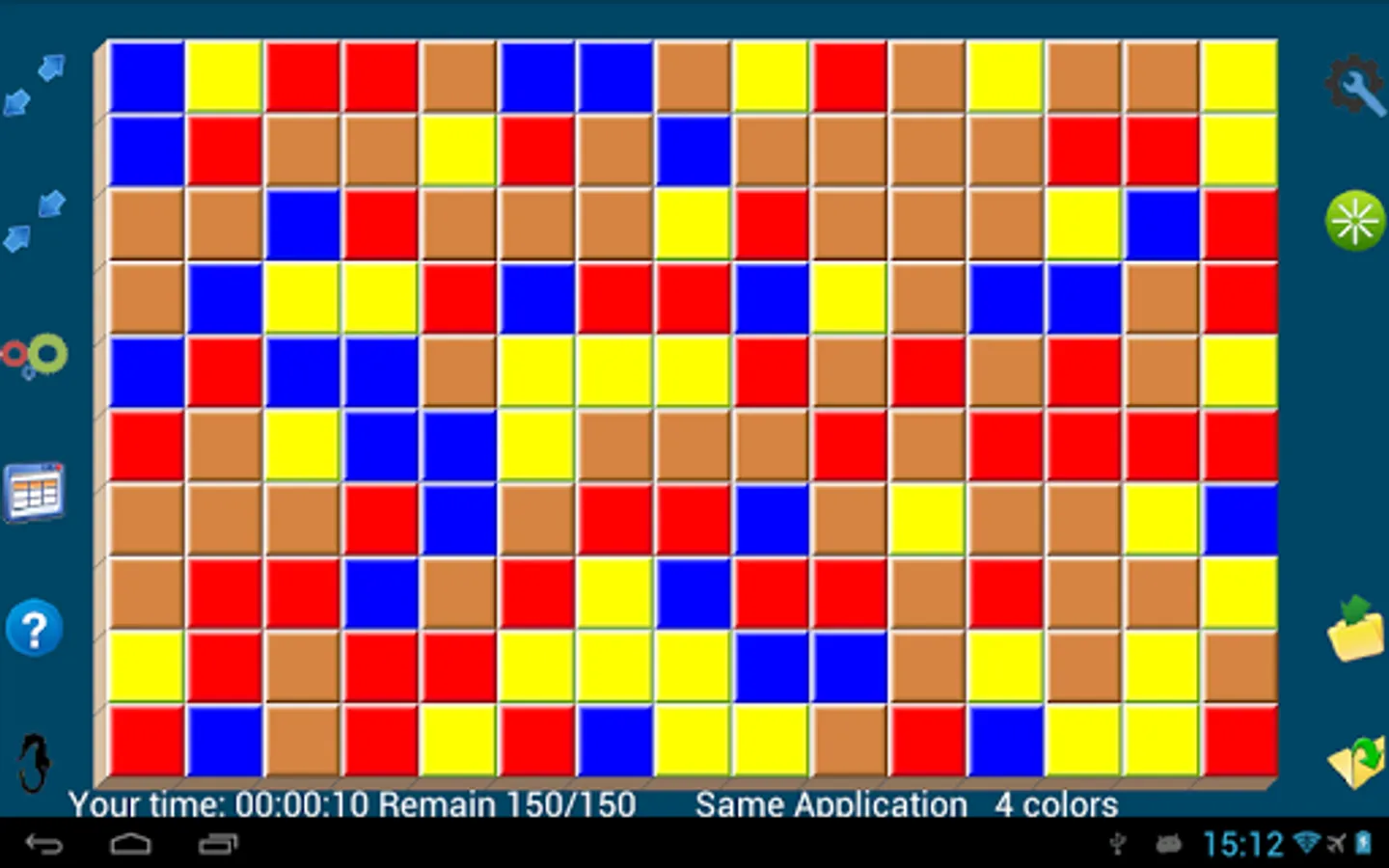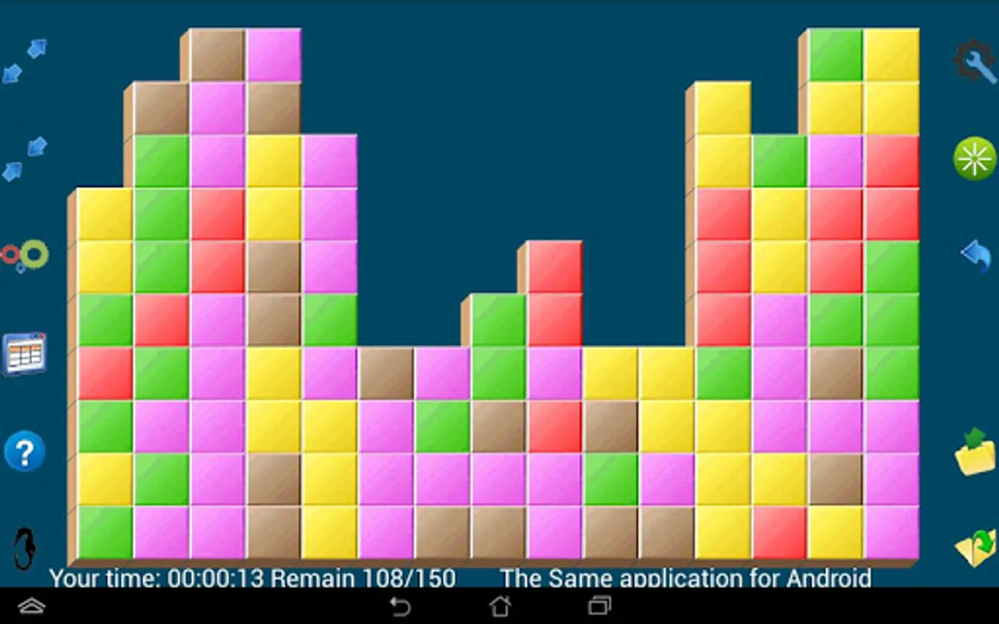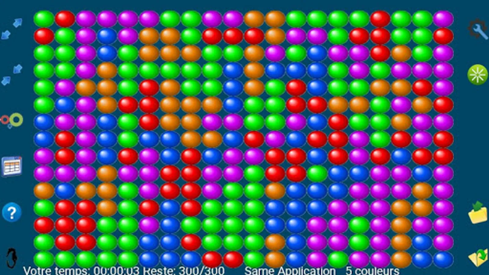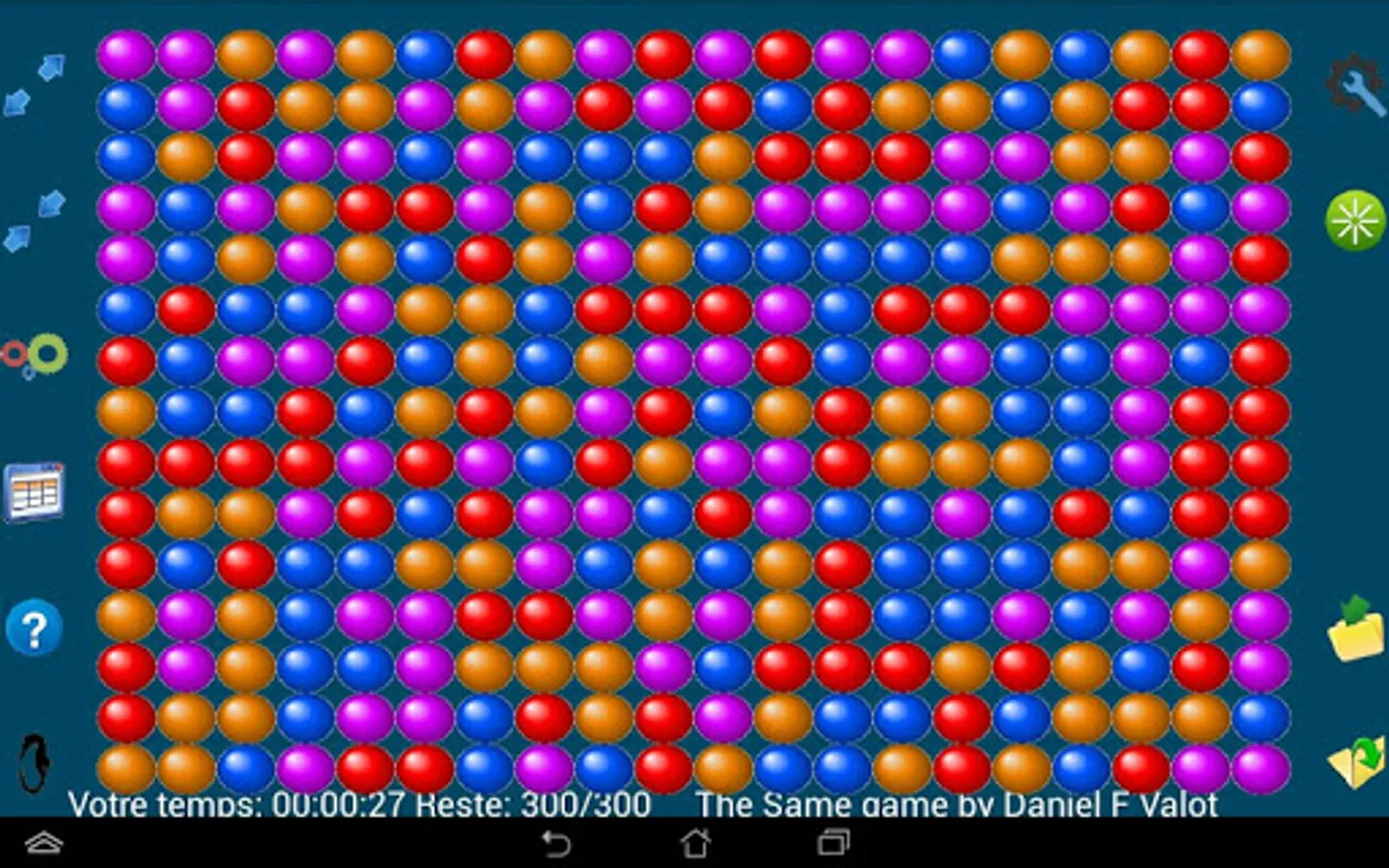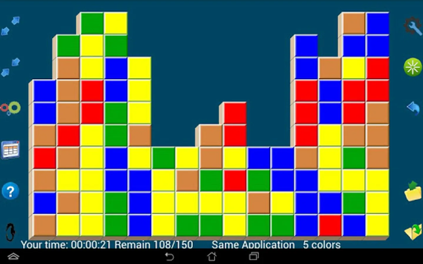 The "Same Game" is played on a rectangular field, typically initially filled with four or five kinds of blocks placed at random. By selecting a group of adjoining blocks of the same color, a player may remove them from the screen. Blocks that are no longer supported will fall down, and a column without any blocks will be trimmed away by other columns always sliding to one side . The goal of the game is to remove as many blocks from the playing field as possible. Groups of more than two blocks add to the score. The faster the game is played, the higher is the score.