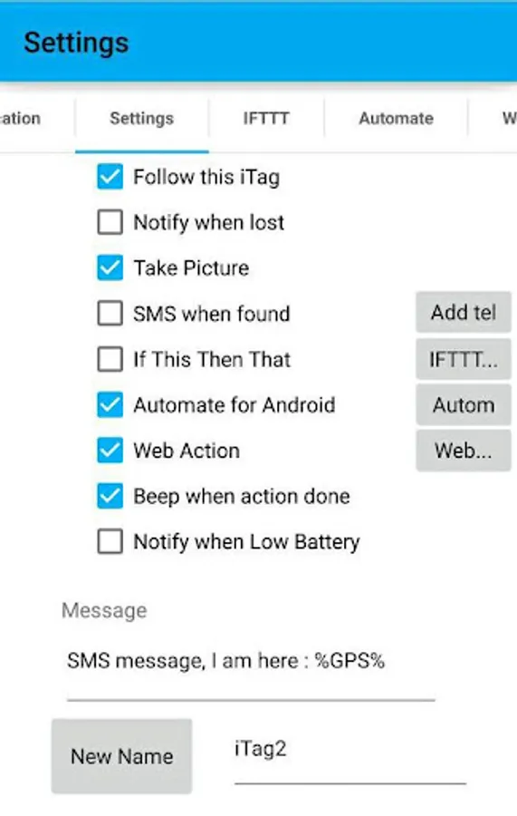iTag Alarm allows to use your iTag as "magic button" to take pictures or selfies, to send alarms, location to any of your contacts.