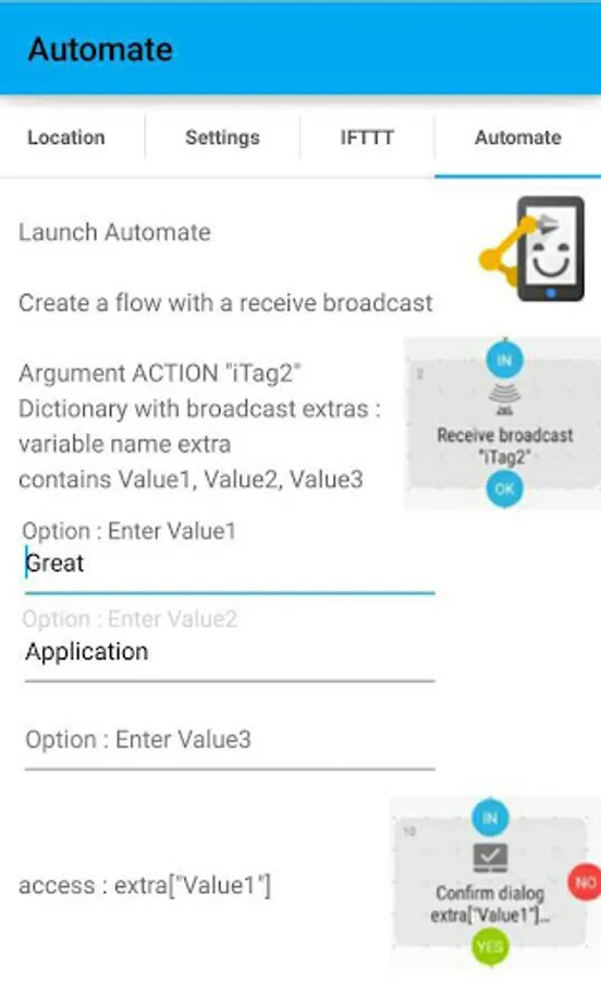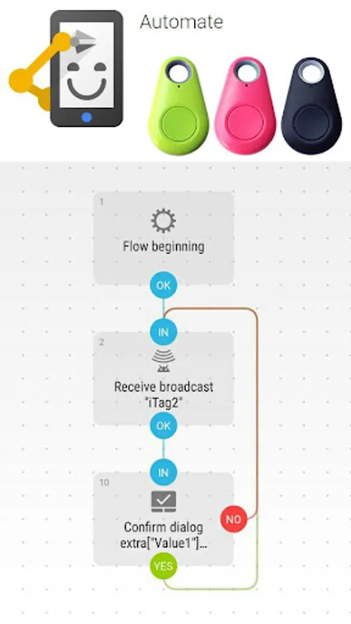 iTag Alarm is fully integrated with "Automate for Android". With your "magic button" launch any flowchart,