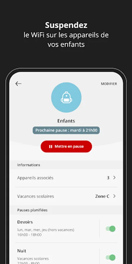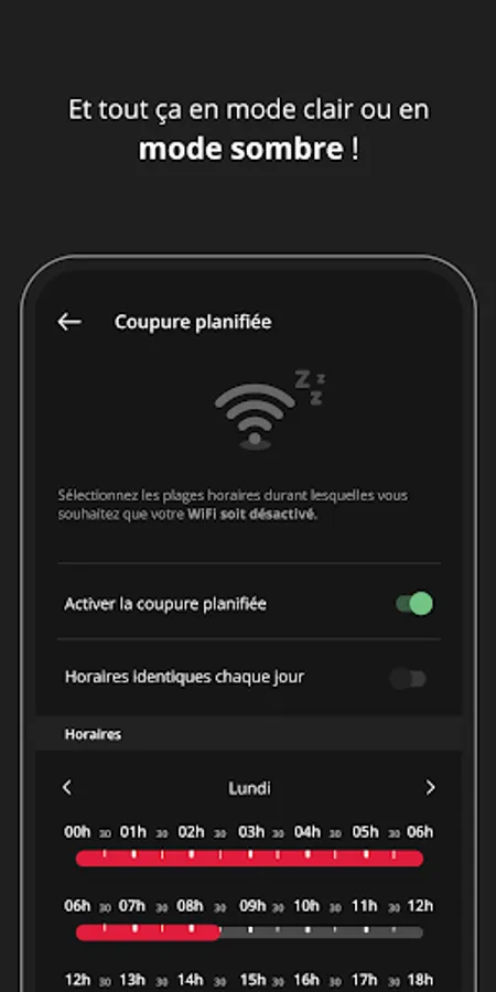 Get peace of mind by automatically turning off WiFi at night. And if you wake up earlier than expected, you reactivate it with one click.