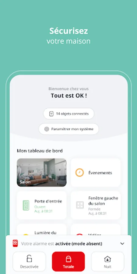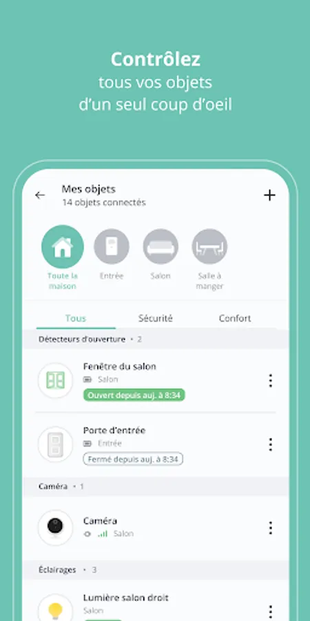 Track the activity of your home and make sure everything is in order. Movements, openings of doors and windows, lit lamps: nothing escapes you.