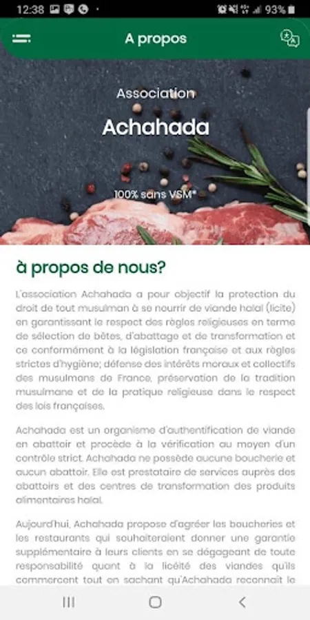 The Achahada association aims to protect the right of all Muslims to eat halal (legal) meat by guaranteeing respect for religious rules in terms of selection of animals, slaughter and processing, in accordance with French law. and strict hygiene rules; defense of the moral and collective interests of Muslims in France, preservation of the Muslim tradition and religious practice while respecting French laws.