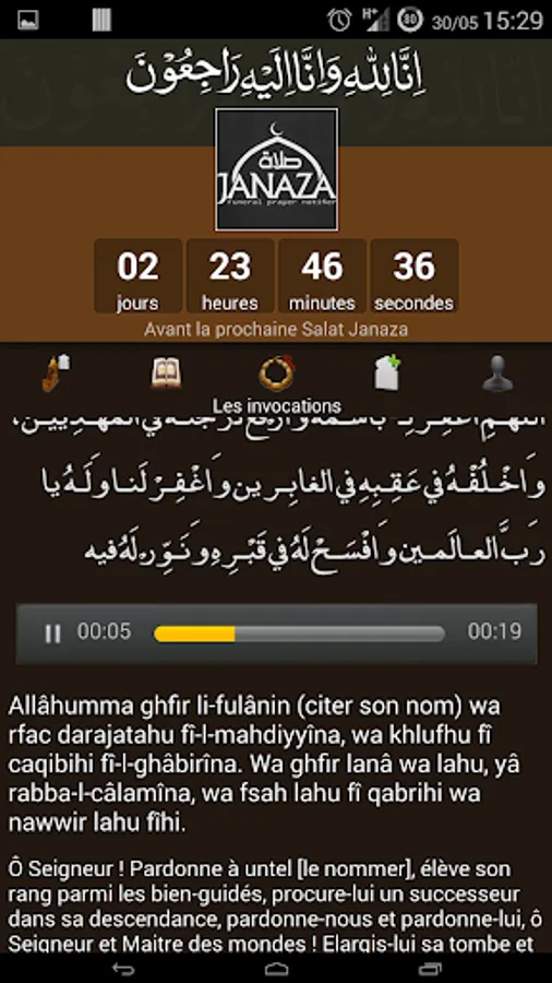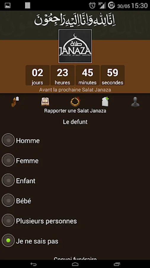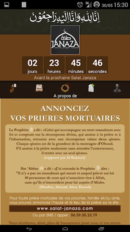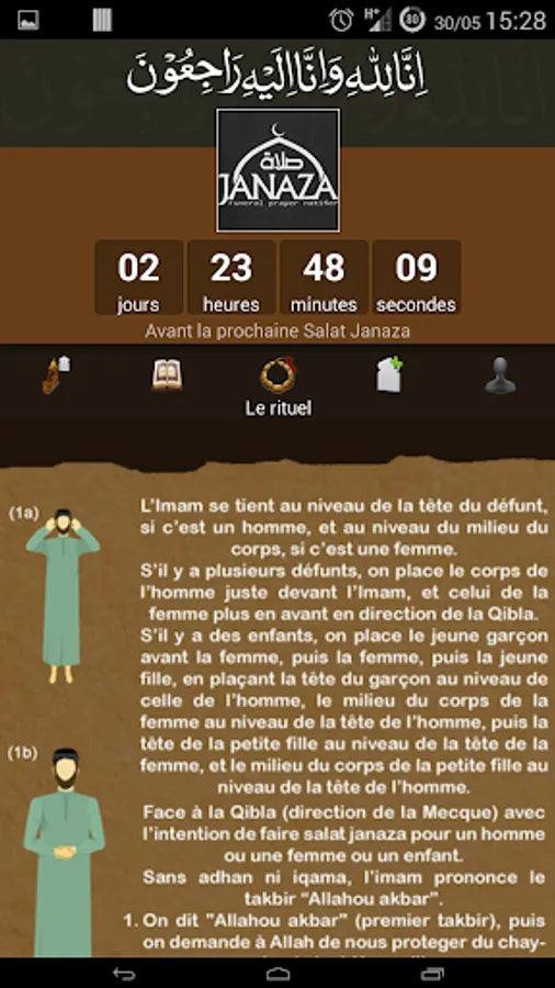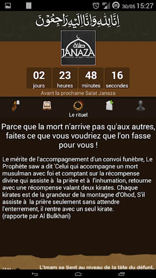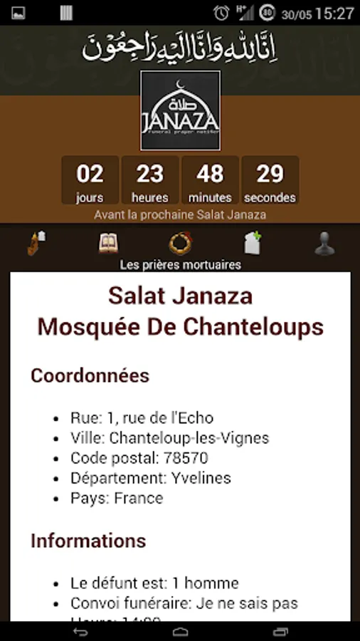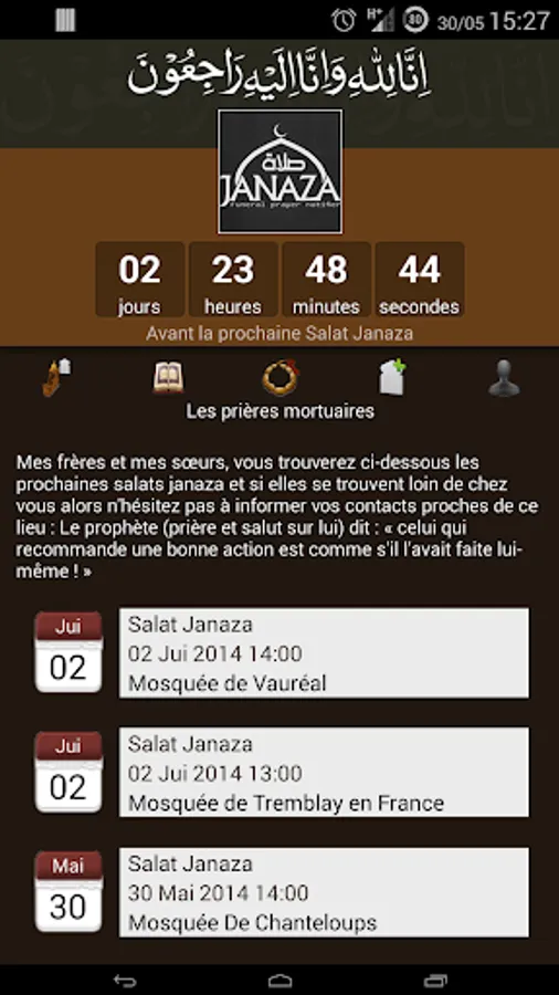 The purpose of the application is to inform the Muslim salat holding janaza (funeral prayer) in the Ile de France and some major cities in France.