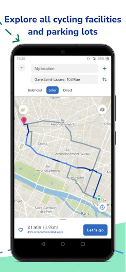 With its comprehensive mapping, Geovelo also allows you to quickly find bike infrastructure, parking facilities, and bike racks nearby.