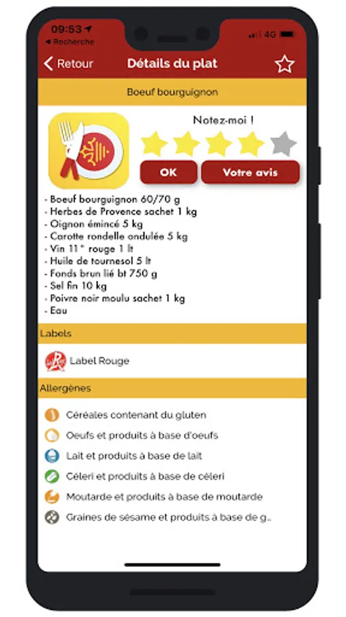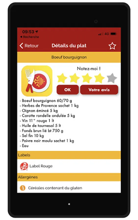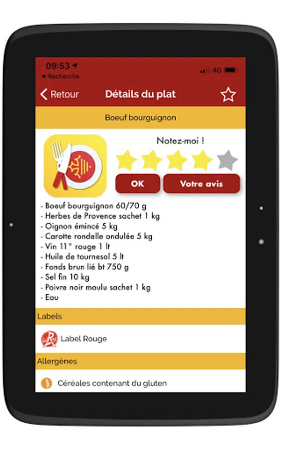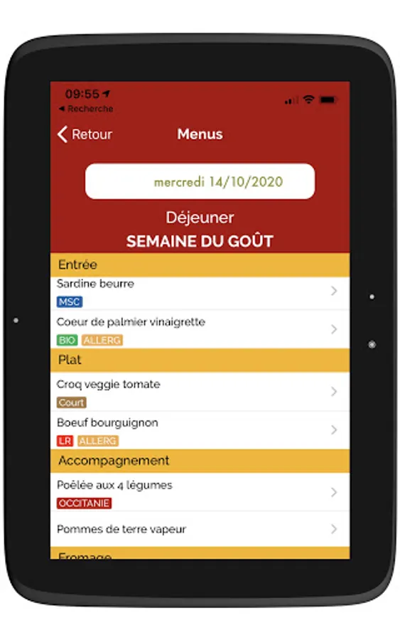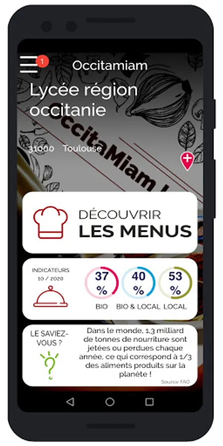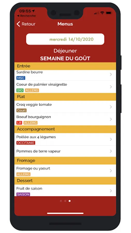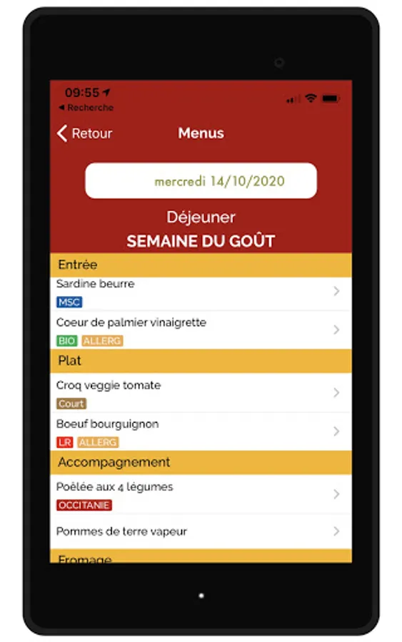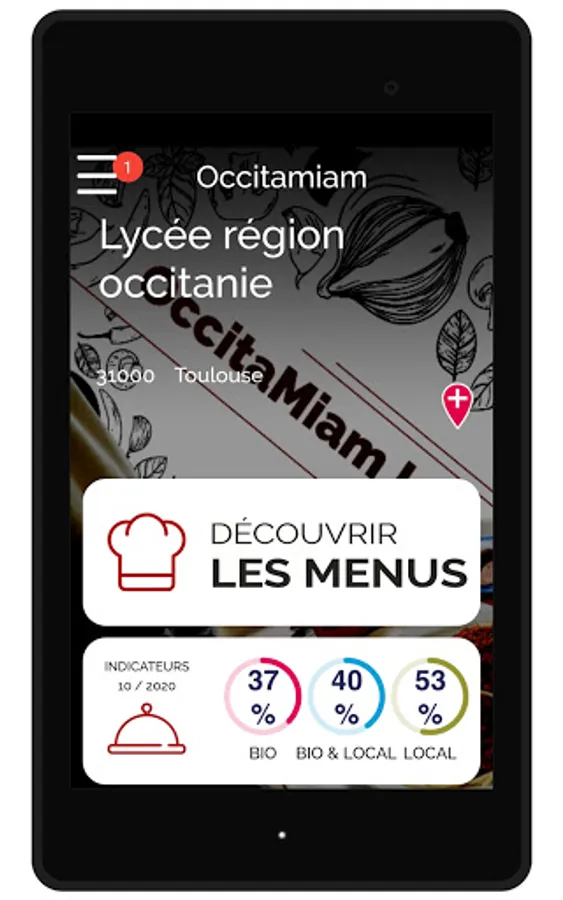 You are studying in a high school in Occitanie: find on your smartphone the menu offered by your self. Every day, from starter to dessert, consult the list of allergens present and the labels of the products used by your canteen (organic, local, etc.).