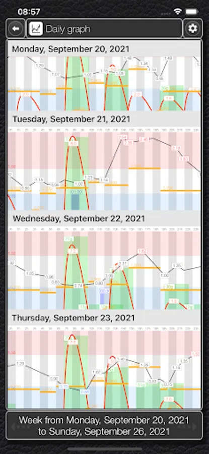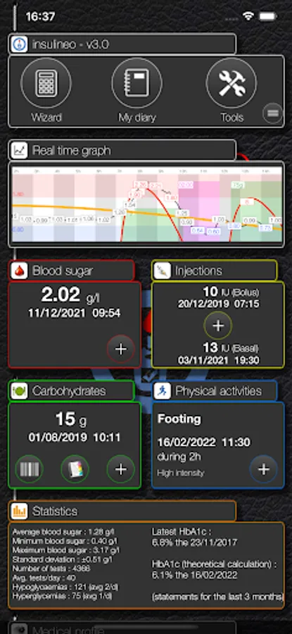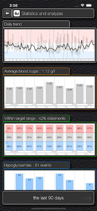 Insulineo offers you several modes of display of your self-monitoring notebook. Either in the form of a complete history of all the information entered, or in the form of a classic notebook identical to paper format, or in the form of graphs. It also tells you the statistics that doctors usually ask for. It even calculates a theoretical value of your Hb1Ac (glycated hemoglobin). You can email your self-monitoring book and statistics directly to your doctor.