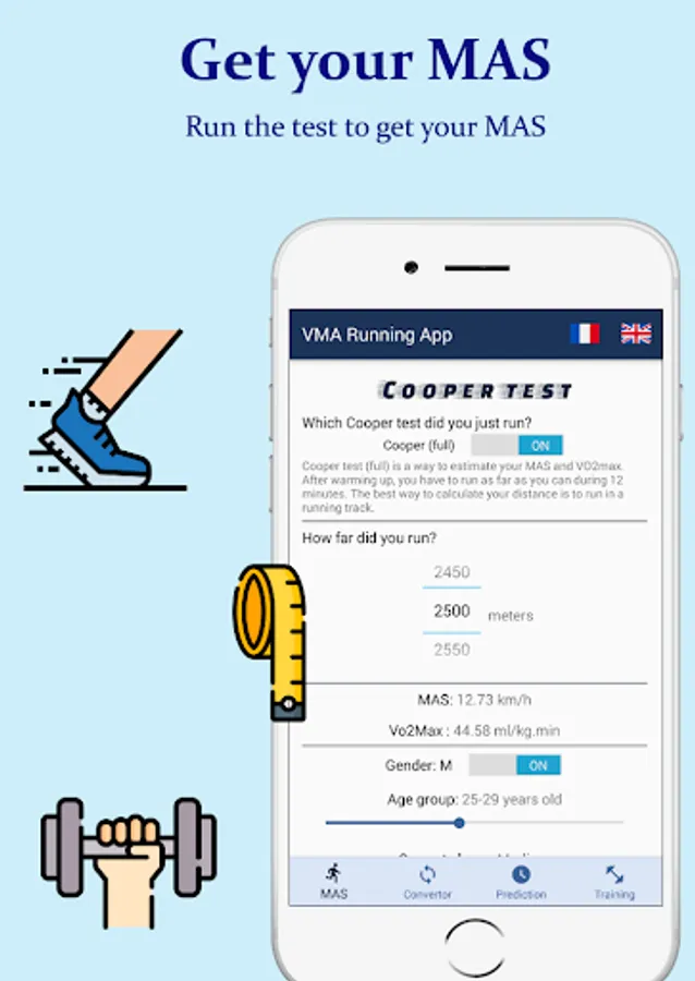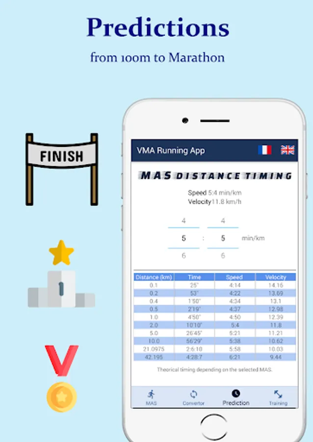 MAS / VMA Running App can be used to convert from min/km to km/h. Very useful to know your speed average for a race and during your training (Maximal Aerobic Speed / Vitesse Maximale Aérobie).