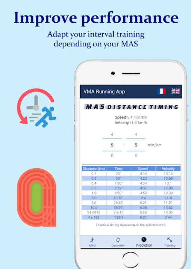Get specific interval training time following your speed (MAS). See your prediction time (1km, 5km,10km, half marathon, marathon...) following the speed and the percentage of your skills. Choose a training percentage to get an idea of your speed following your training day session.