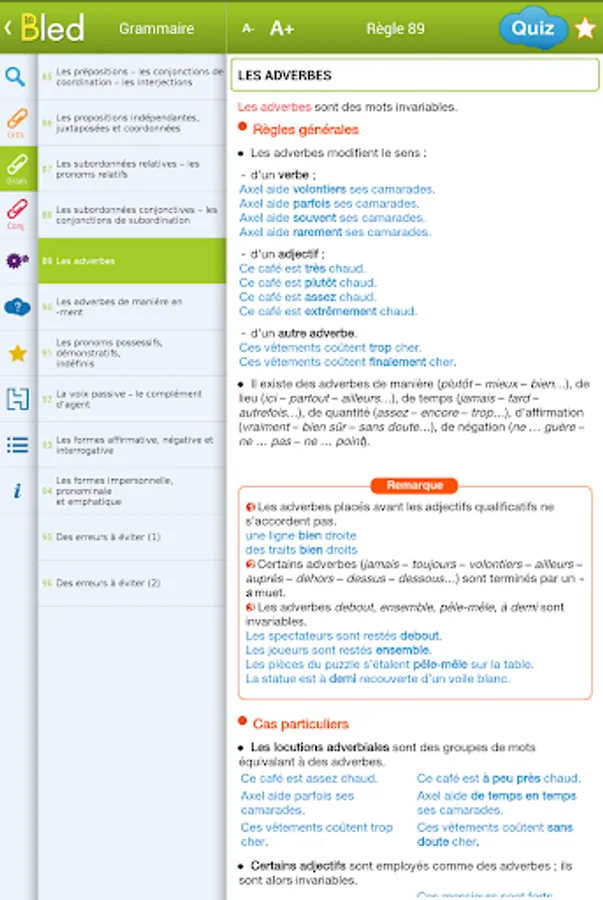 The quiz can also be accessed freely at random, always with a potential return immediately to the rules.