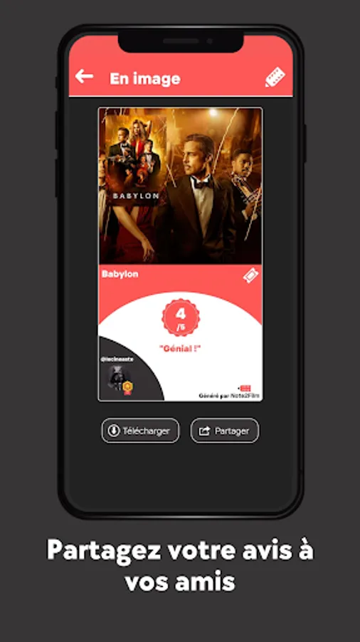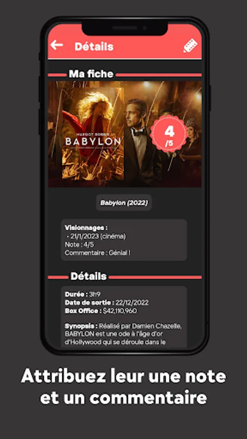 With Note2Film, save all your viewings in one place! The application allows you to have a follow-up on your activity in the cinema and on the streaming platforms!