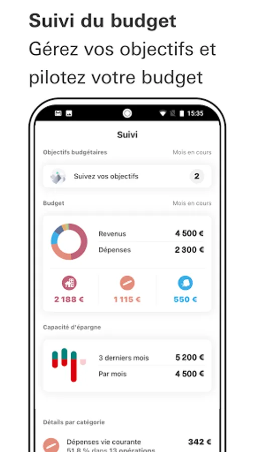 Observe the distribution of your expenses quickly and easily thanks to customized statistics by category and make savings while controlling your budget