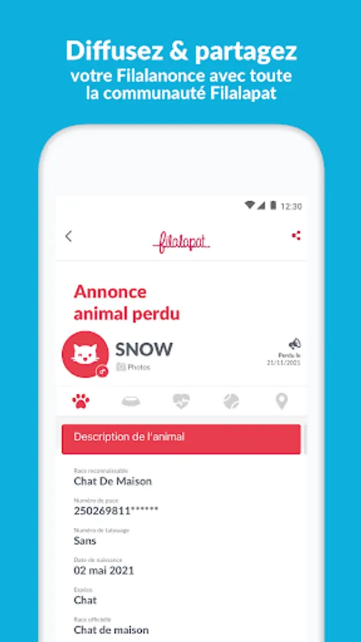 Backed by the National Identification File, the only official file approved by the Ministry of Agriculture and Food, Filalapat allows animal keepers and the general public to simplify their actions in case of loss or search for a stray.