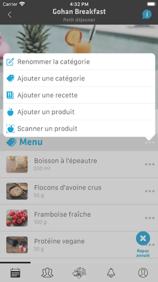 Your entire schedule is flexible. You will be able to modify the times of your meals and sessions at your convenience, modulate your meals in real time to adjust the information according to what you actually consumed (modification of grammages, etc.), add notes to your meals and sessions to specify your feelings.