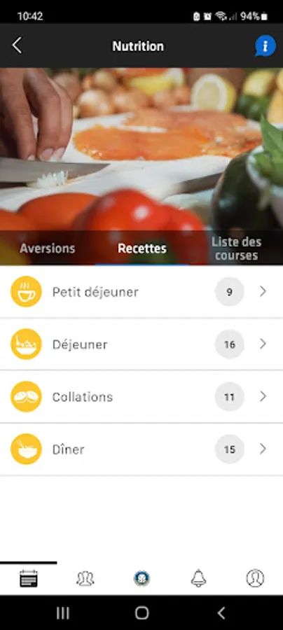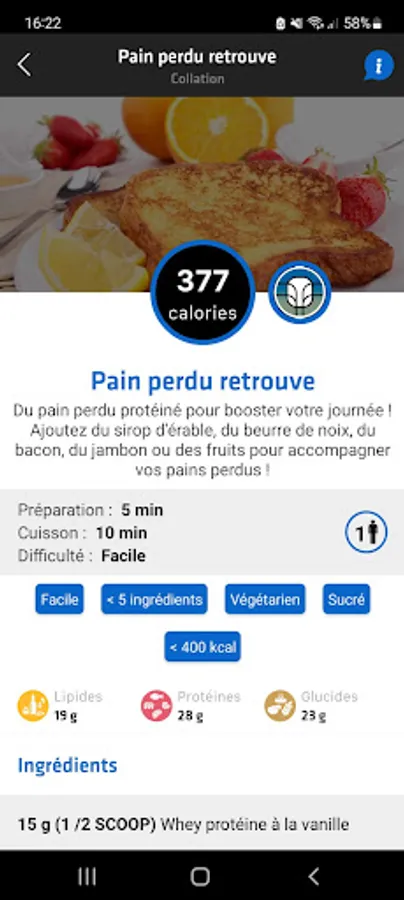 Don't waste any more time thinking about what you are going to eat, the application lists you all your day's meals, while detailing the energy intake and macro-nutrients provided.