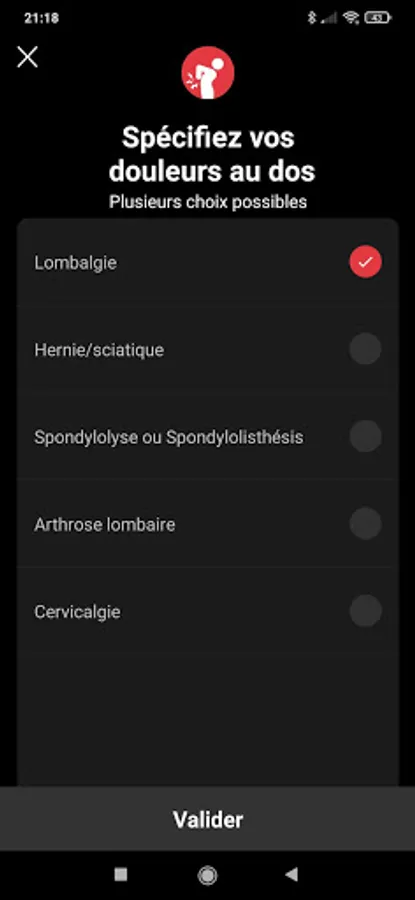 If an exercise is incompatible with your pain, it will be indicated by a red triangle and variants will be offered to you.