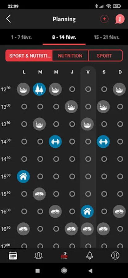 In the application, you will have access to many features, such as your schedule where you will find your sports sessions and your dietary monitoring.