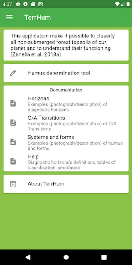 TerrHum allows to standardize the topsoil (Humipedon) classification and to understand the soil functioning. The full citation reference for this application is as follows: Zanella G., Zanella A., Bronner T., Pousse N., 2021. TerrHum. From: Humusica Applied Soil Ecology Special issues vol. 122a and 122b, https://www.journals.elsevier.com/applied-soil-ecology/special-issues. Classification updated in 2021. Android version: Bronner T., TerrHum, Google Play, Education; original iOS application: Zanella A., TerrHum, App Store, Education. Translation in French and Italian: Tatti D., Ponge J.-F., Le Bayon R.-C., Chersich S., Stanchi S., Carollo L., Zanella A.