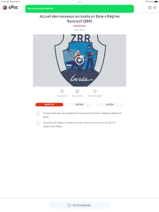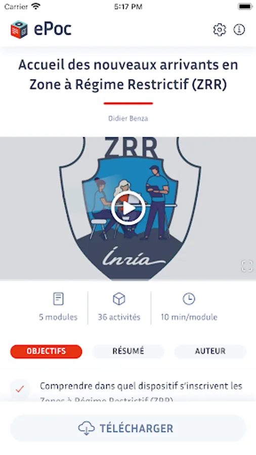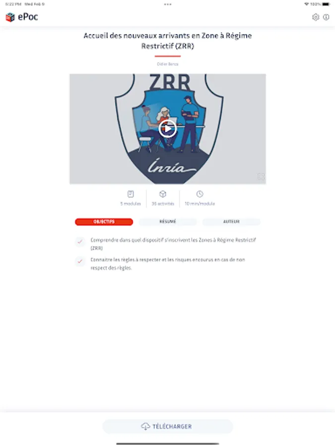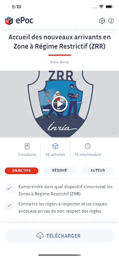 ePoc is a free and open source mobile e-learning application developed within the Inria Learning Lab. This version of the ePoc application is intended for the training of new Inria arrivals in Restricted Regime Zones.
