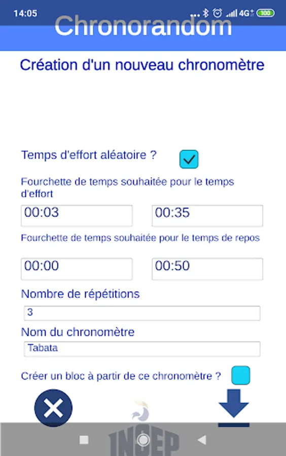 You can choose the number of repetitions of your two durations, give a name to your chronometers and manage your chronograph library