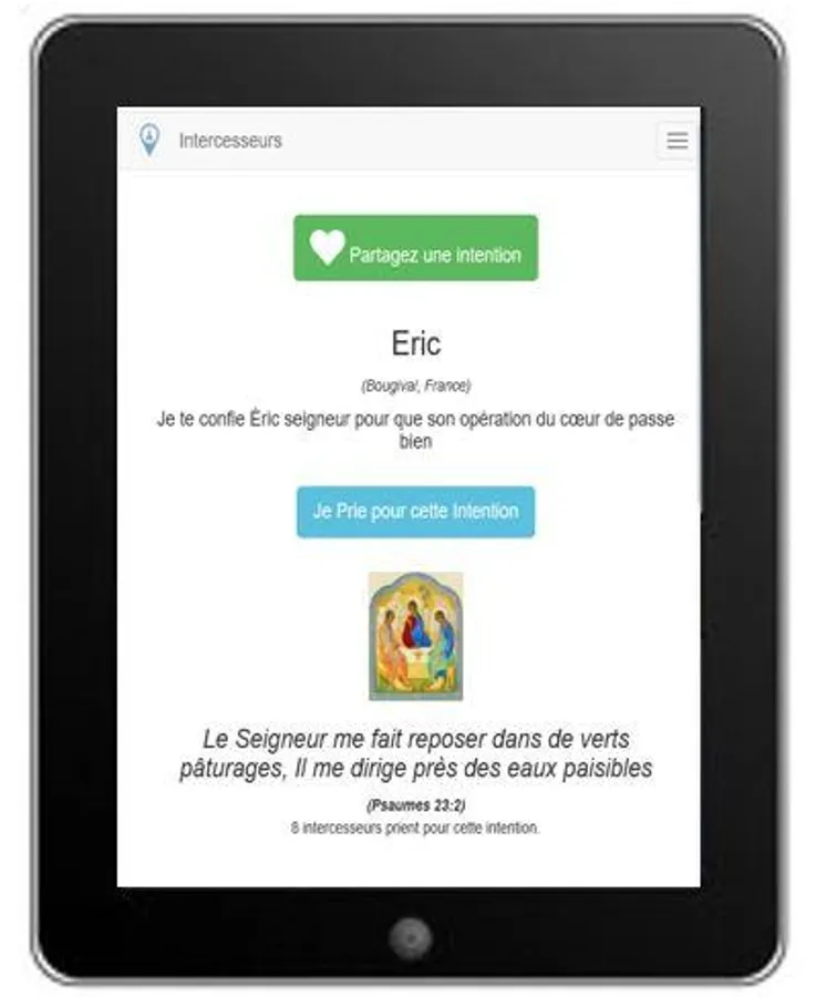 • See and pray for the intentions of her neighborhood (the 20 closest to her). The intentions are proposed in slideshow with an icon and a biblical verse.