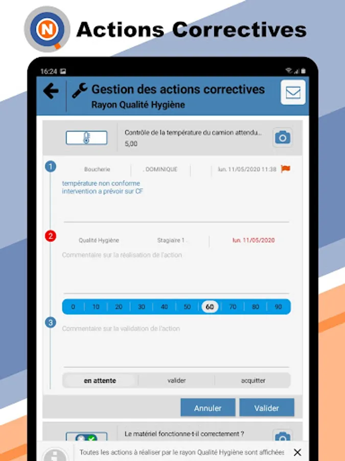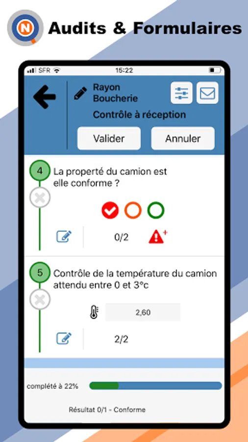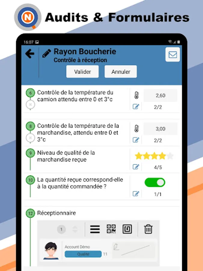 - Yes / No questions, conformity, number, graduation, temperature, date and time, text, multiple choices, list, photos, customizable formats ...