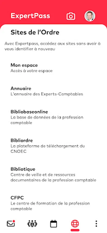 5. Access to the sites of the Order: The integrated authentication of Expertpass will allow you to navigate directly, on your smartphone, in the private spaces of the various sites of the Order: Private site, Clubs, Infodoc-experts, Bibliobase, Library, Shop… A mine of information at your fingertips!