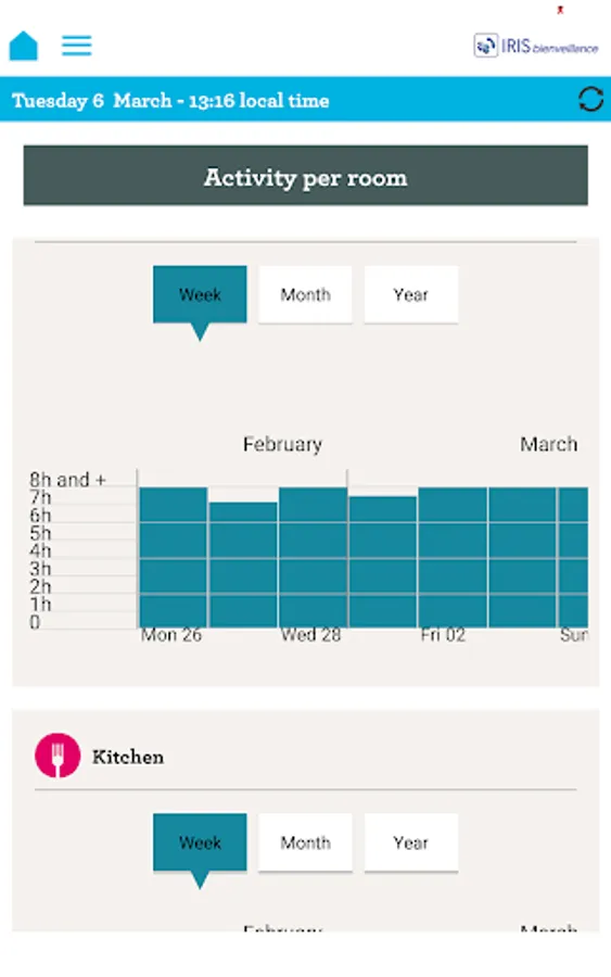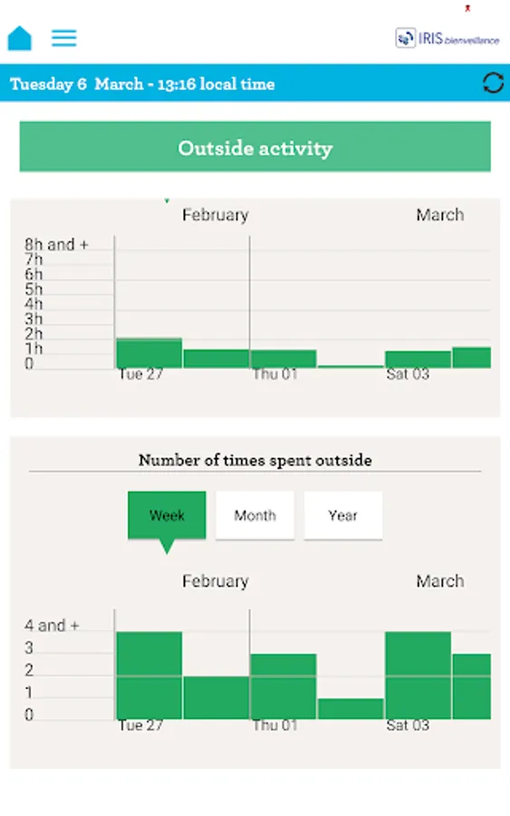 - Analyse daily activity, outside activity and activity per room as a snap shot, or monitoring progress over a longer period of time.