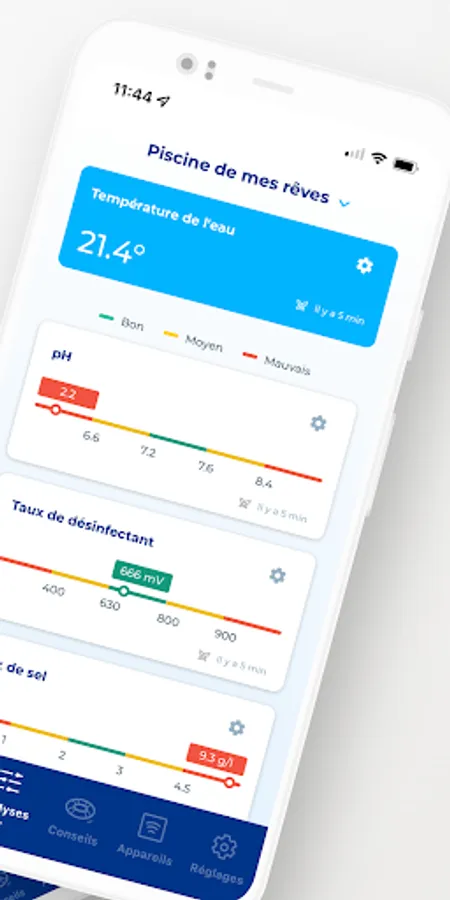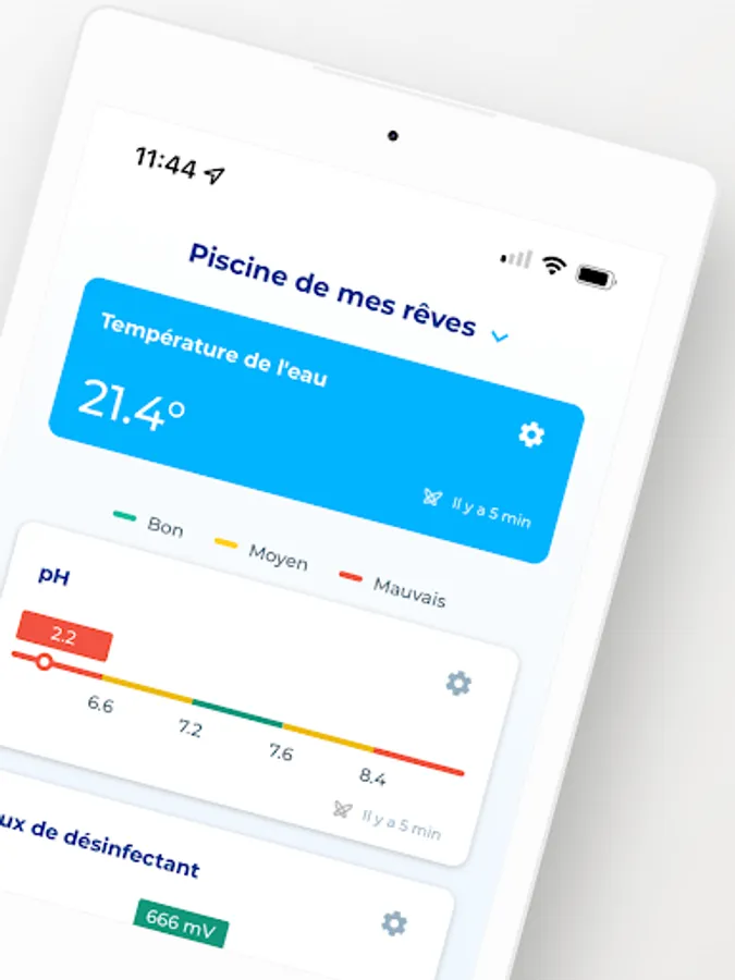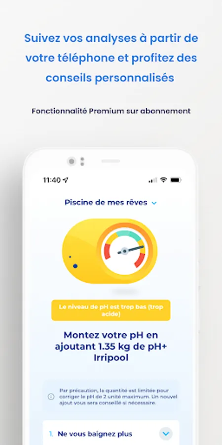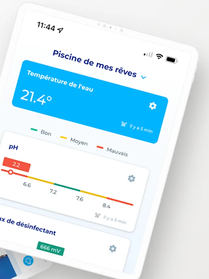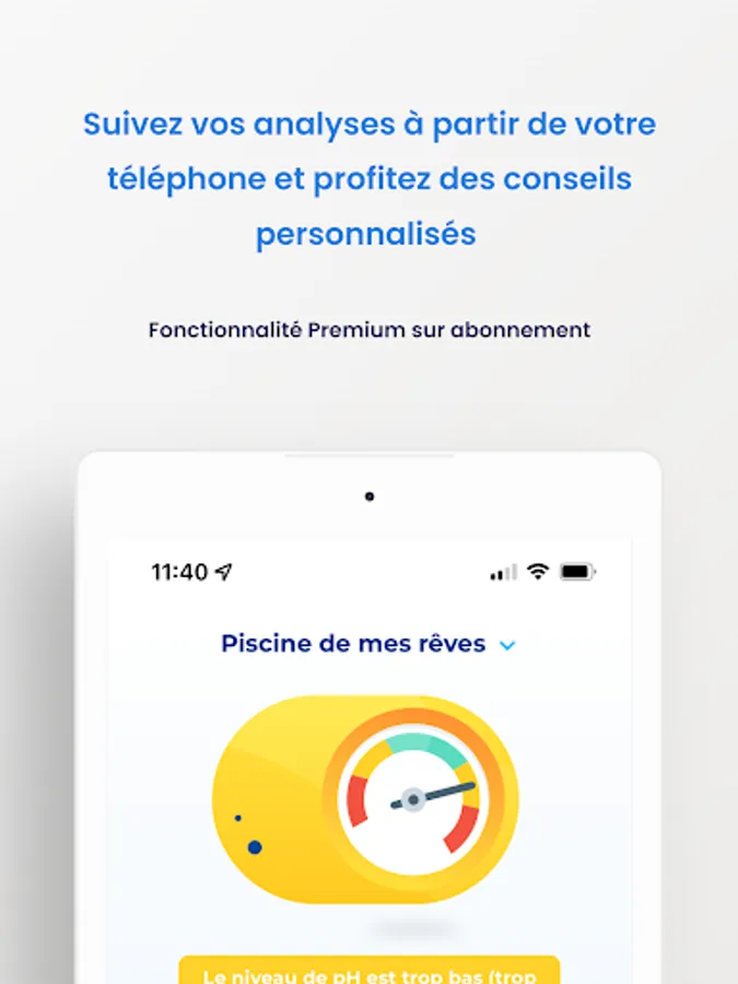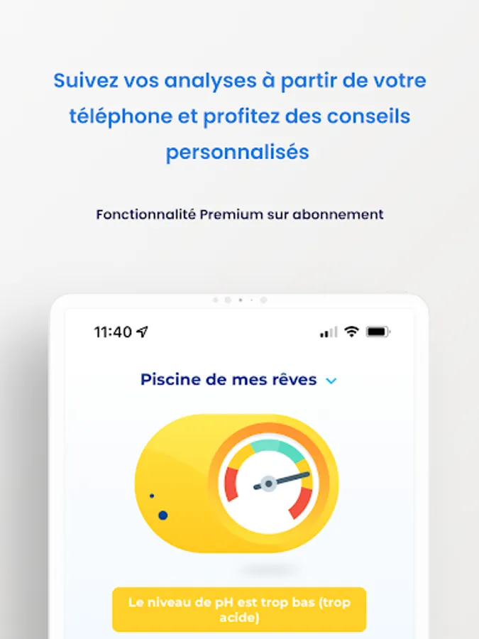 On subscription, be alerted in the event of a problem in your pool, receive personalized advice and dosages, find the history of your measurements as well as the weather and UV indices for 5 days.