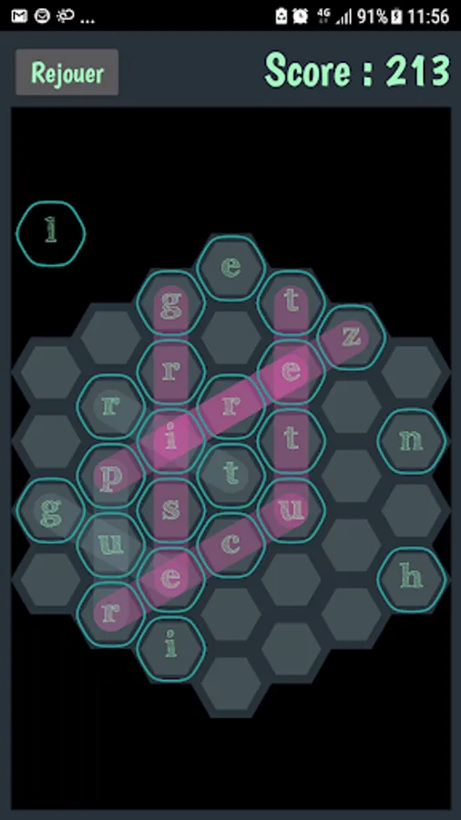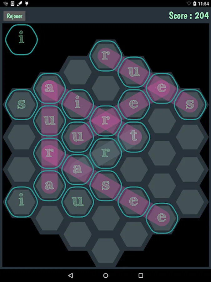 In this letter game, you must get the highest score possible by placing letters in a hexagonal grid. Words can be formed in any direction, and it is possible to put a letter on in occupied space by pushing a line of letters in the desired direction