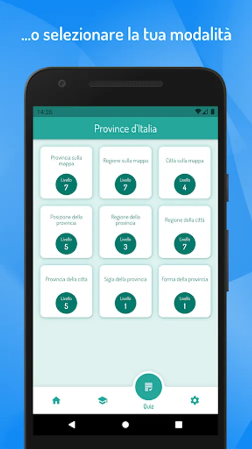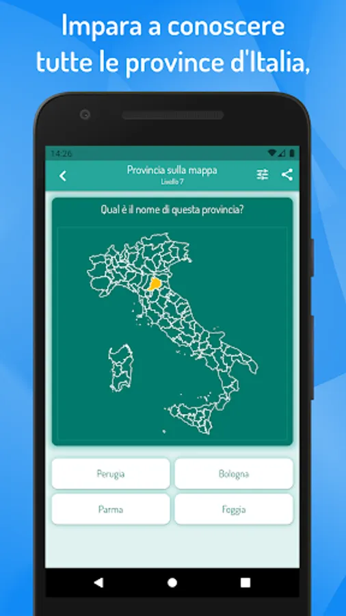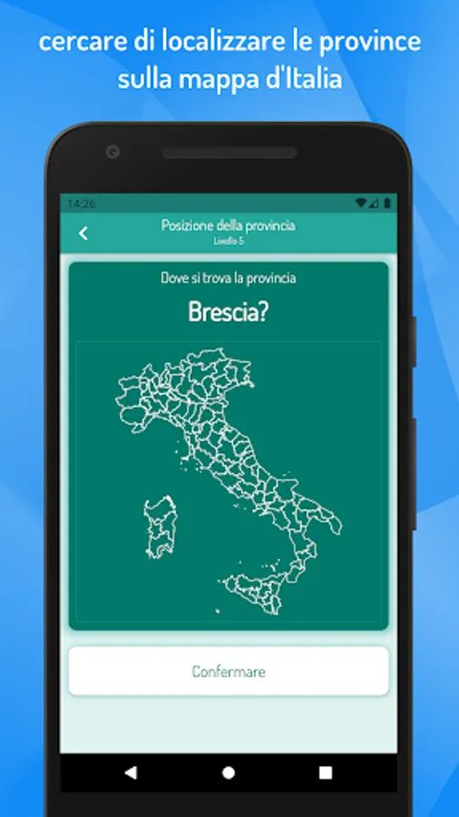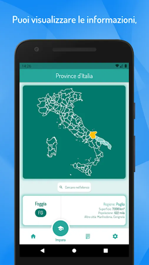 To know the Italian provinces, simply select the learning mode and click on the map of Italy to view the details of the province, including the region in which it is located, its acronym, area and population.