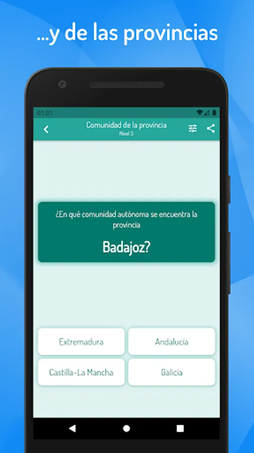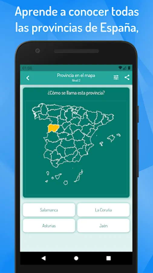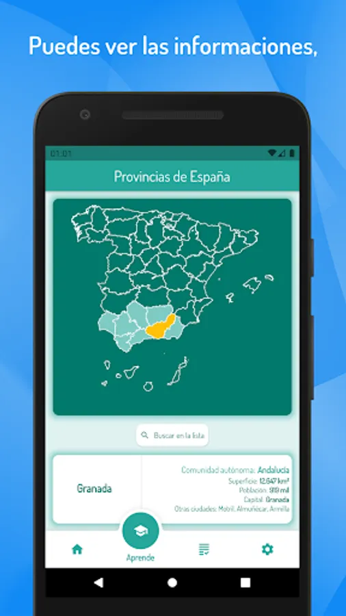 To know the Spanish provinces, simply select the learning mode and click on the map of Spain to see the details of the province, including the autonomous community in which it is located, area and population.